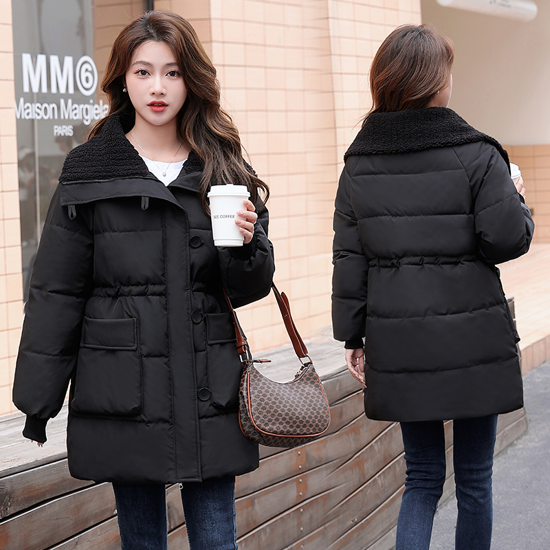 洋气羊羔毛领收腰棉袄大码宽松羽绒棉衣女中长款加厚秋冬棉服外套