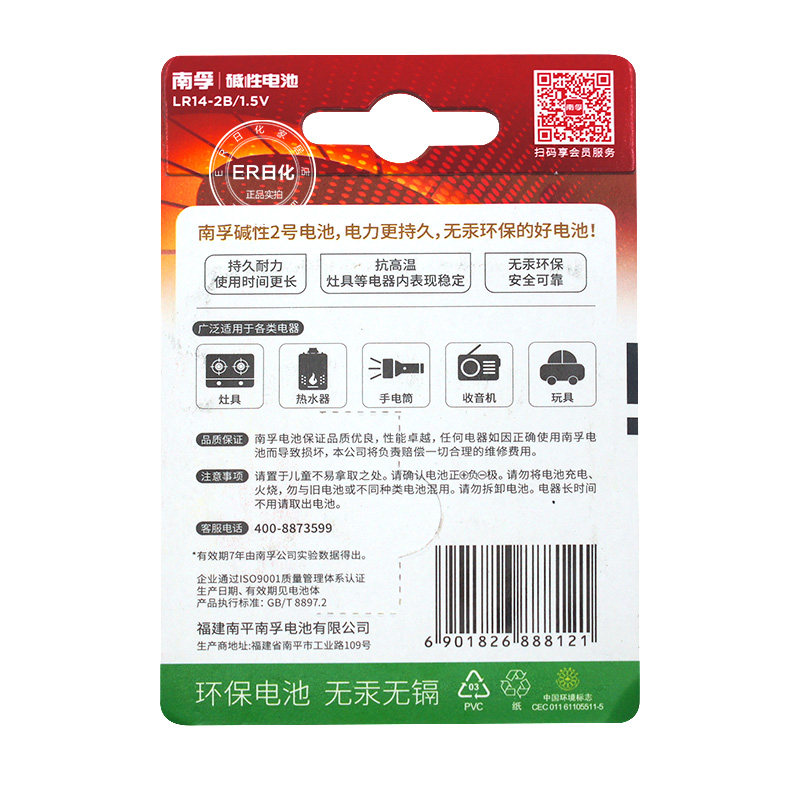 南孚二号电池碱性电池2号2粒卡装size C LR14 24粒/盒导向仪电池