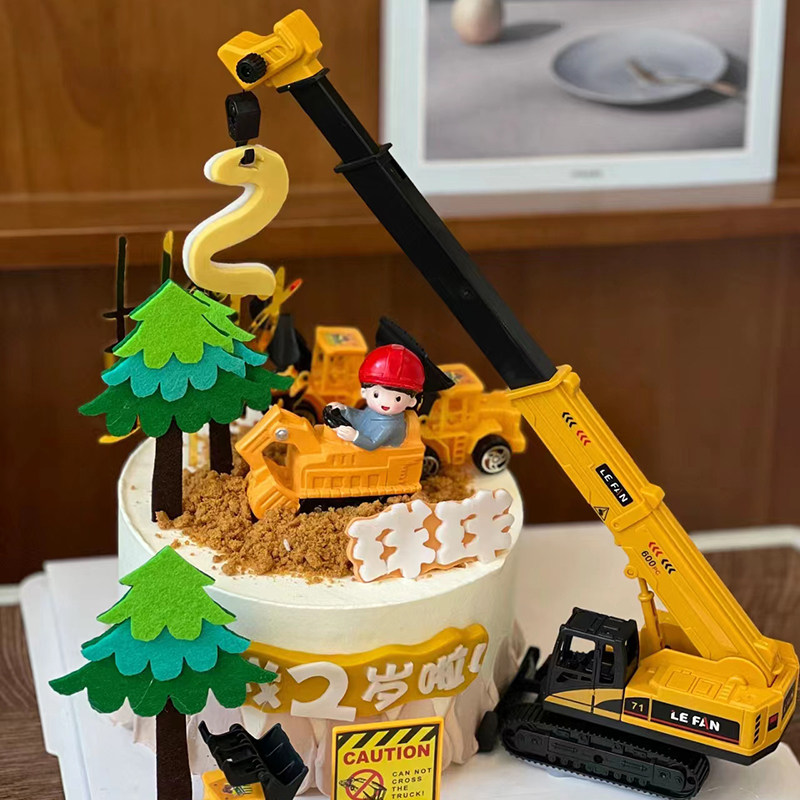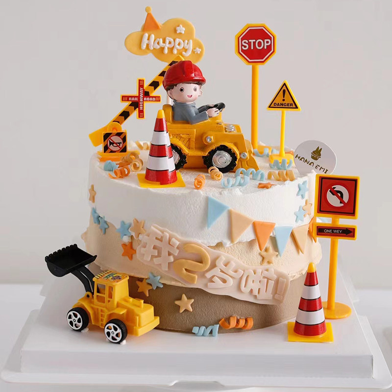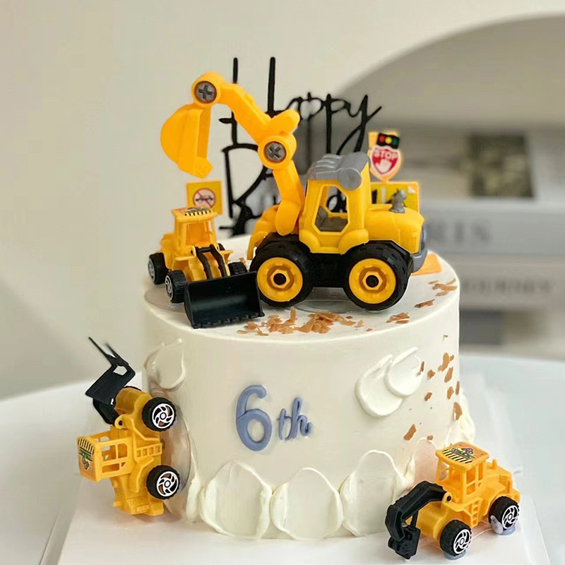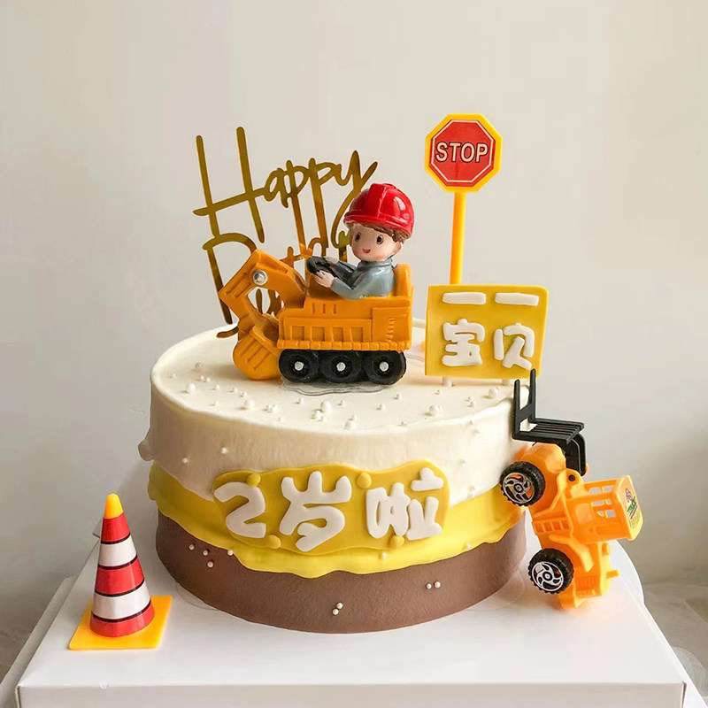 烘焙蛋糕装饰 黄色挖掘机推土机小孩玩偶摆件工程车主题生日蛋糕