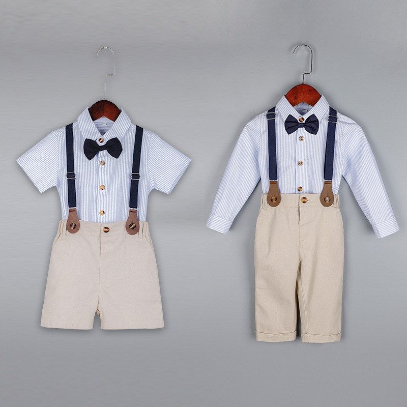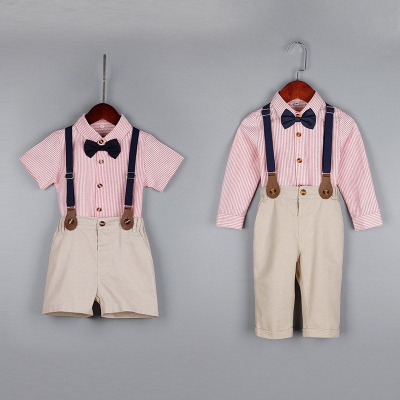 儿童礼服夏季新款男童条纹背带裤两件套宝宝周岁生日短袖衬衫套装