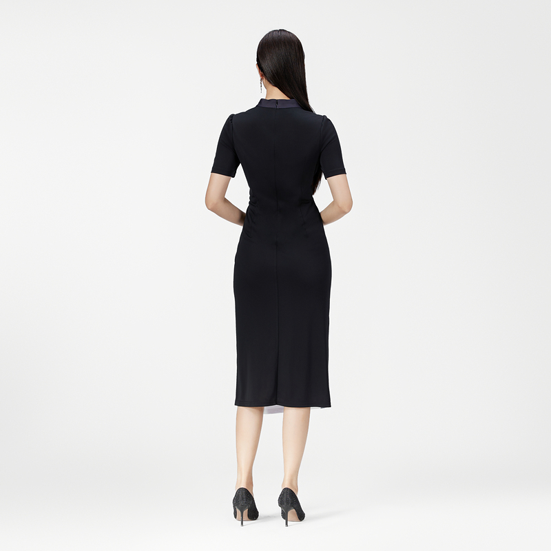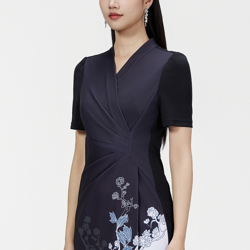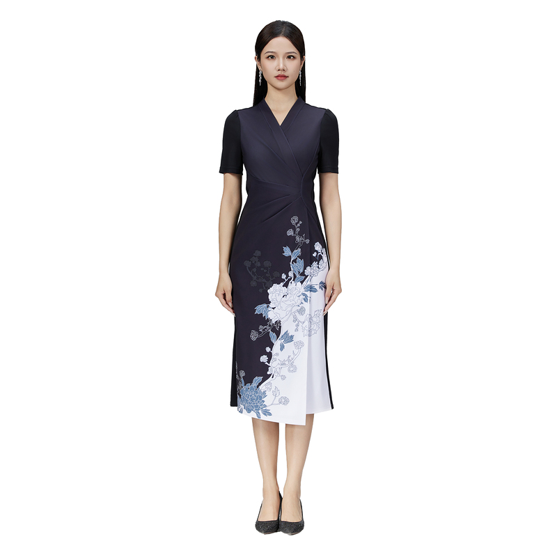 SUSSI/古色25夏商场同款交插领短袖印花前开衩中长连衣裙千金风