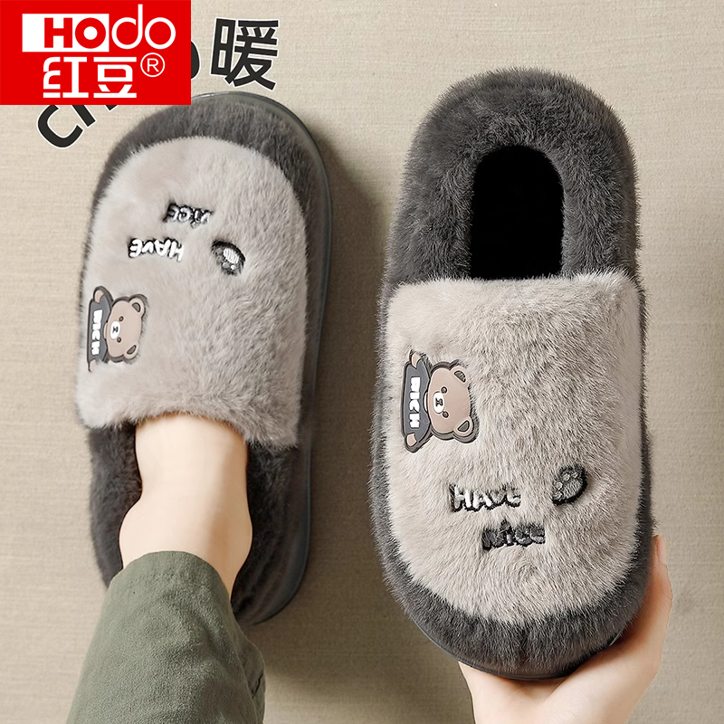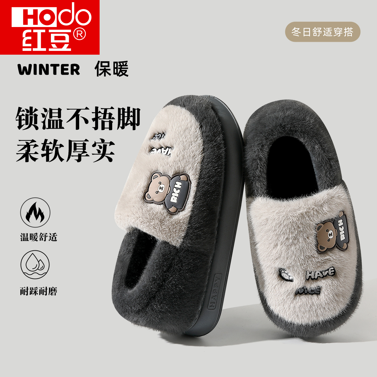 红豆男士棉拖鞋男款冬季包跟2024新款室内家居防滑毛绒保暖棉鞋女