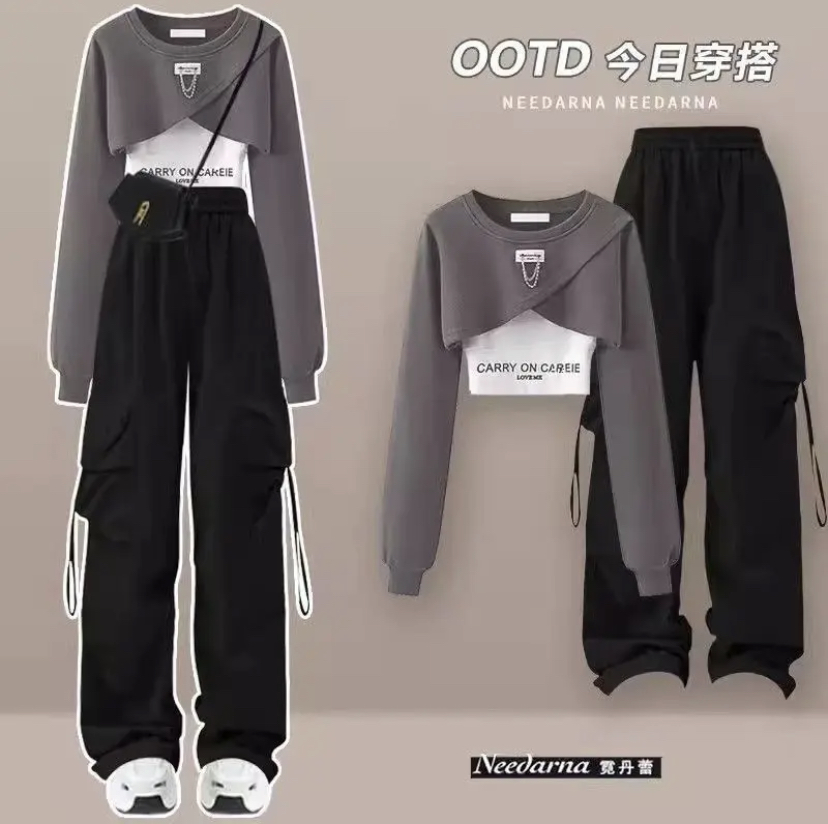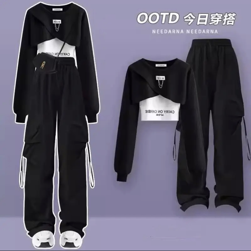 秋装搭配一整套2025新款大童帅气高级感卫衣工装阔腿裤三件套装女