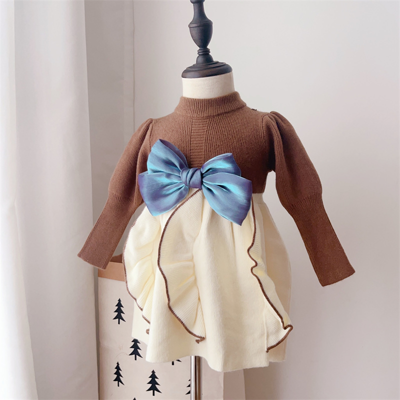 春秋女童连衣裙2024新款儿童洋气宝宝蝴蝶结针织长袖甜美秋装裙子