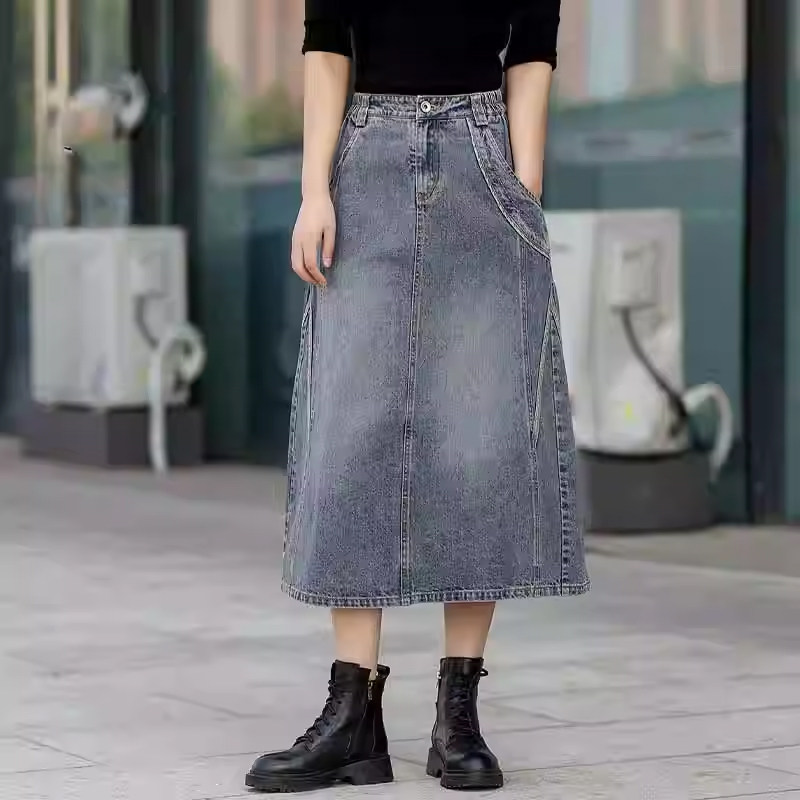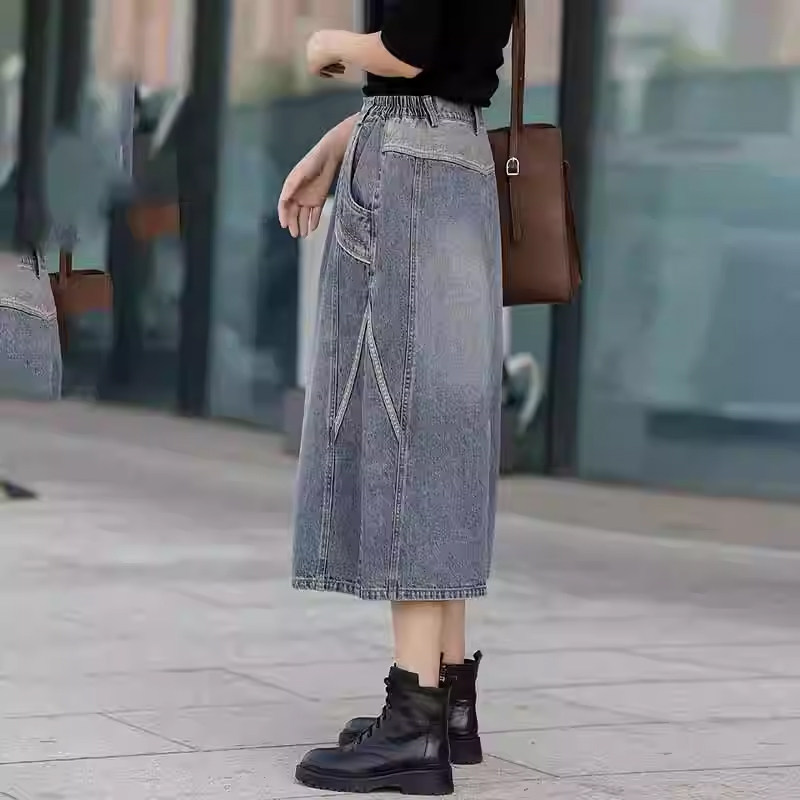 2025年秋季复古牛仔半身裙松紧腰开叉一步裙高腰撞色显瘦A字裙