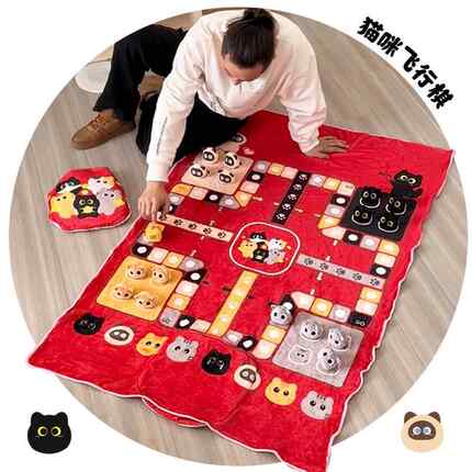 铭创优趣创意喵咪团子猫飞行棋大毛毯趣味亲子互动抱枕毯子二合一