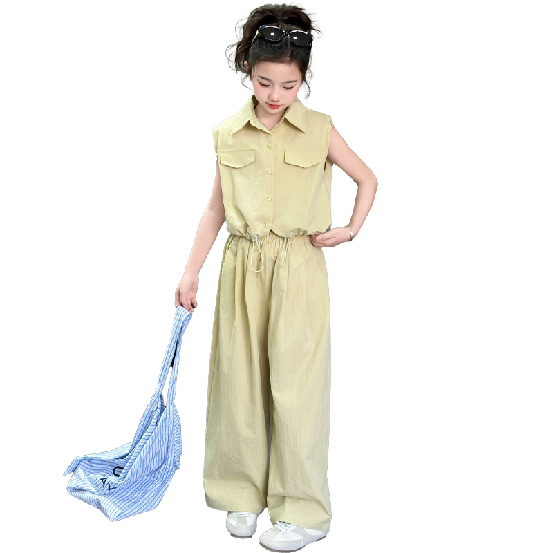 女童夏季工装套装2025新款儿童洋气时髦衬衫马甲休闲阔腿裤两件套