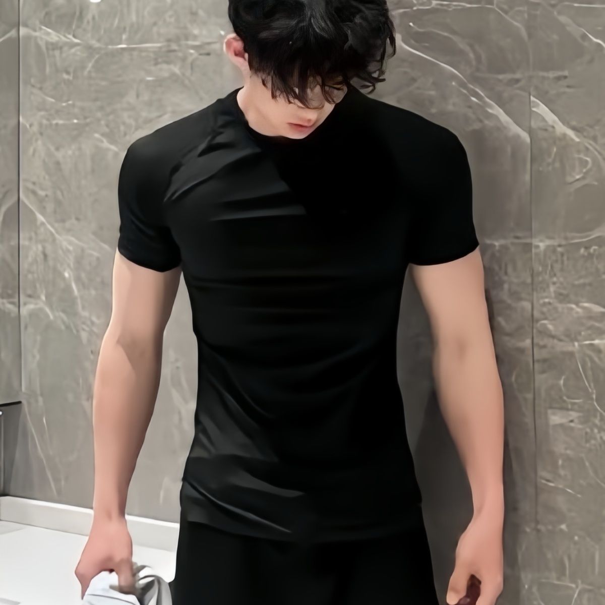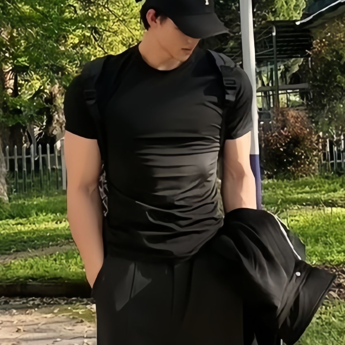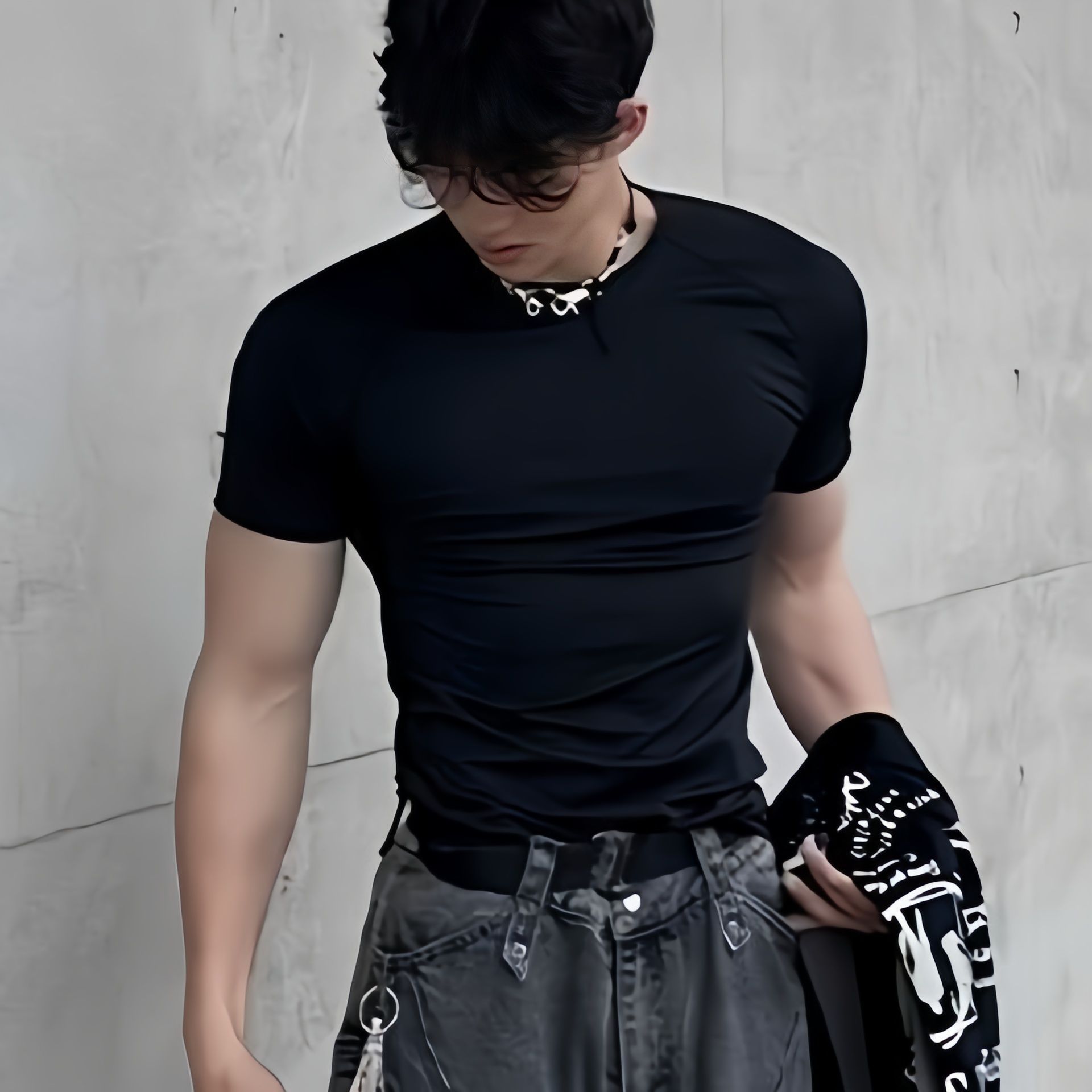性张力穿搭男袖口收紧t恤小领口垫肩短袖显肌肉健身黑色半袖短袖