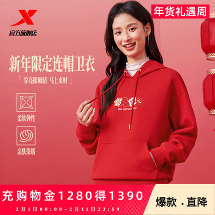【商场同款】特步连帽卫衣女款2026春季新品休闲宽松套头长袖上衣