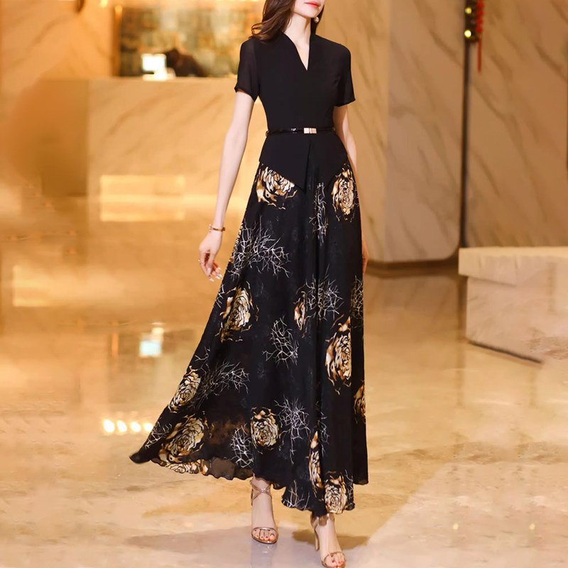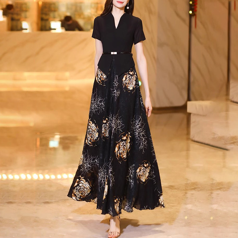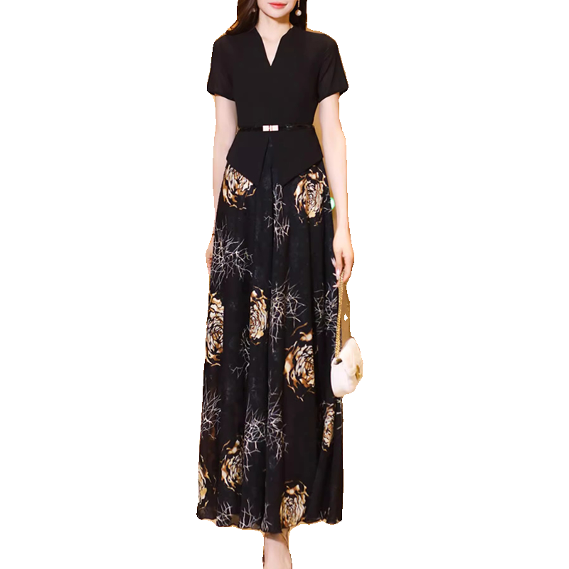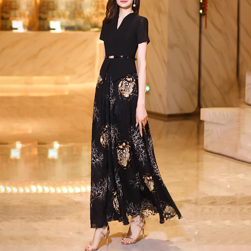 2025夏季新款名媛气质高级感拼接假两件真丝桑蚕丝连衣裙收腰长裙