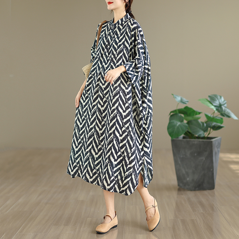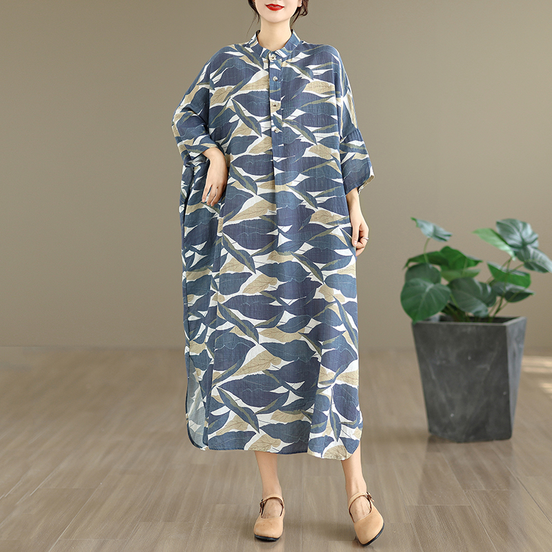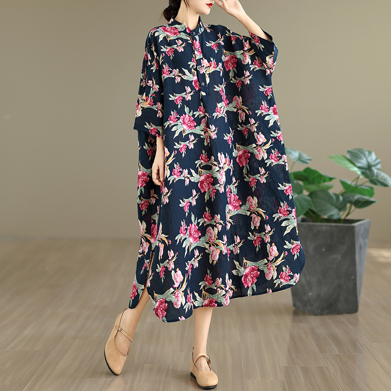 外贸加肥春秋新款气质文艺复古棉麻印花立领宽松超长大码连衣裙
