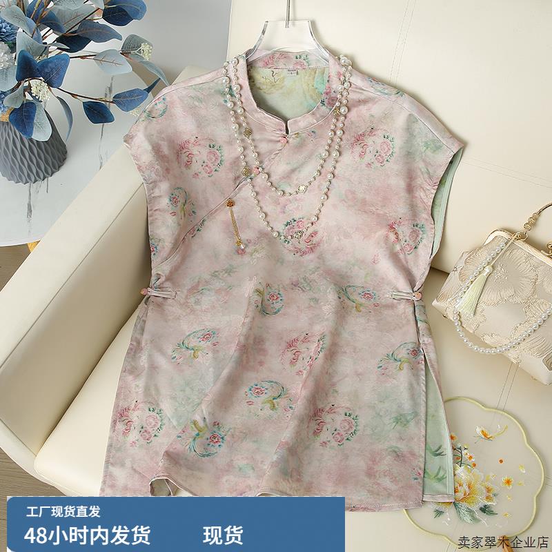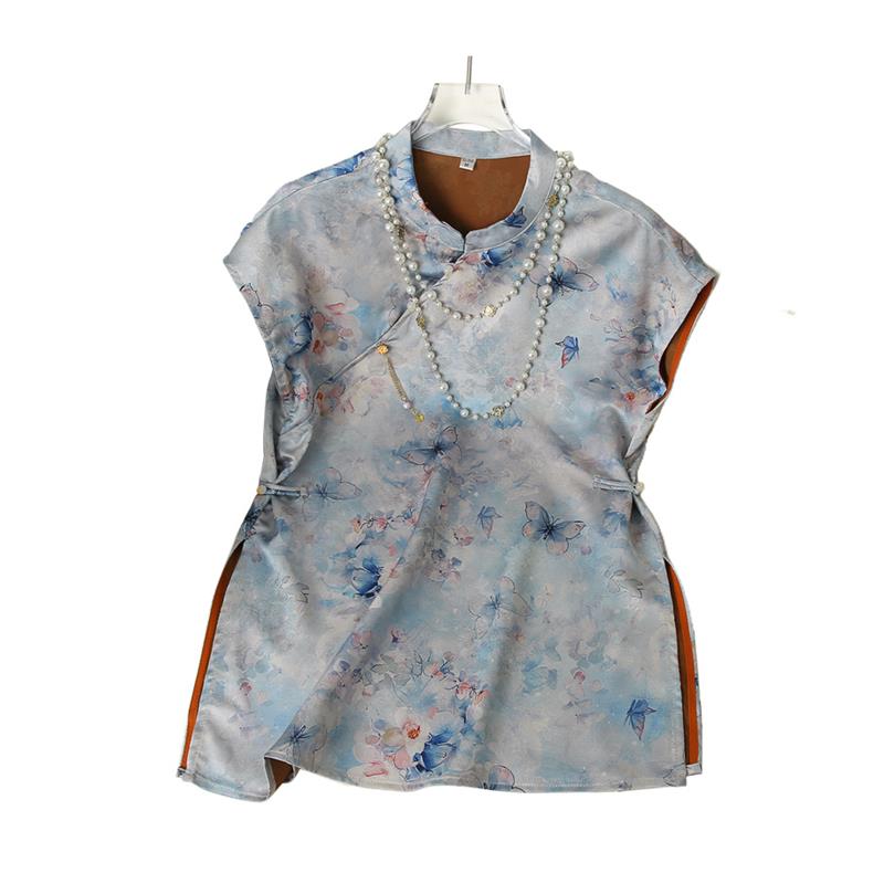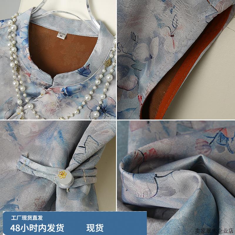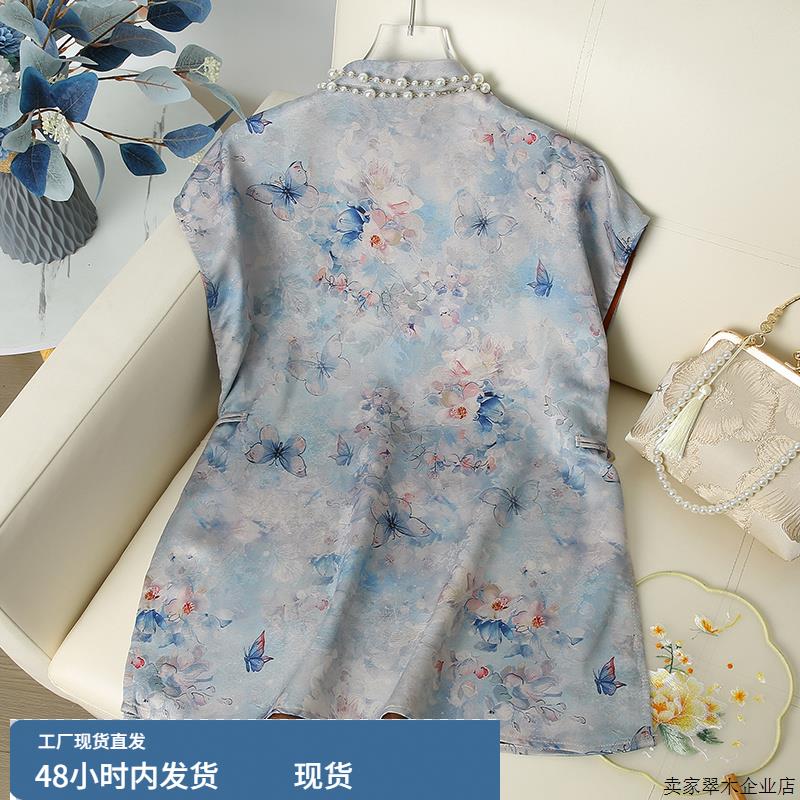 新中式妈妈夏装国风蓝色T恤小衫中老年女装盘扣斜襟短袖唐装上衣
