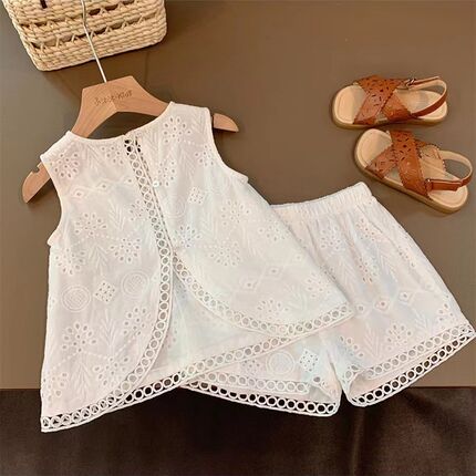 女童夏装新款套装镂空背心蕾丝短裤纯棉两件套甜美女宝宝时髦衣服
