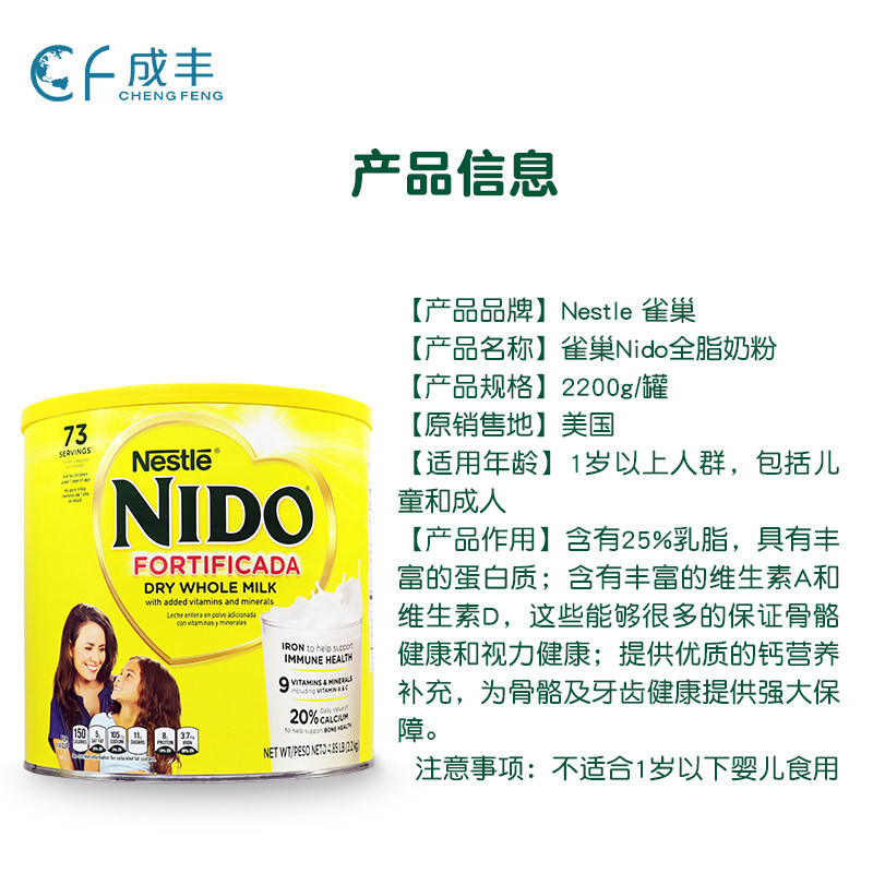 美国Nestle雀巢NIDO全脂即溶儿童成人老年人全年龄奶粉2200g