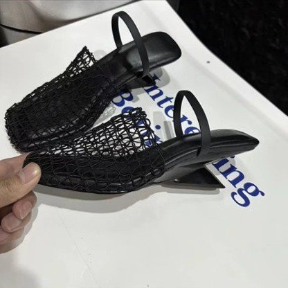 包头半拖鞋女外穿2025年夏季新款网面镂空凉鞋透气粗跟坡跟渔网
