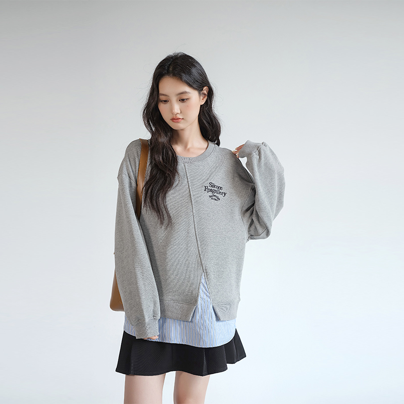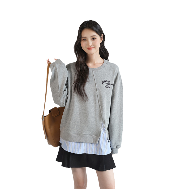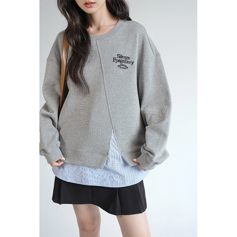 蓝若水大码女装条纹假两件刺绣灰色卫衣胖mm秋季新款宽松炸街上衣