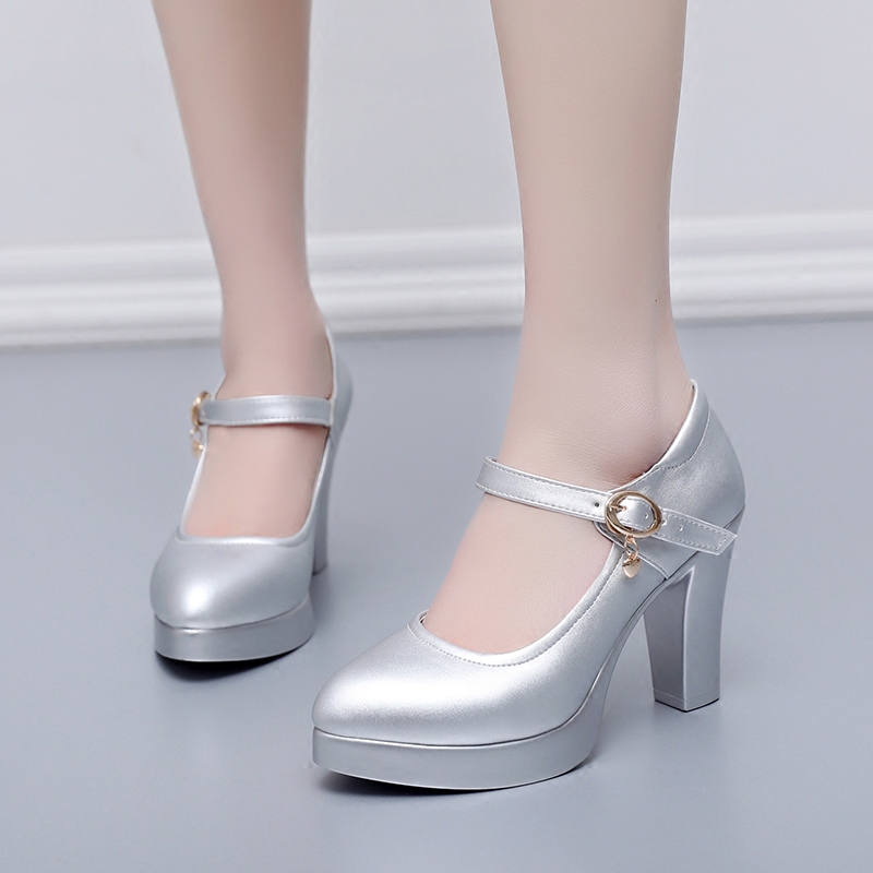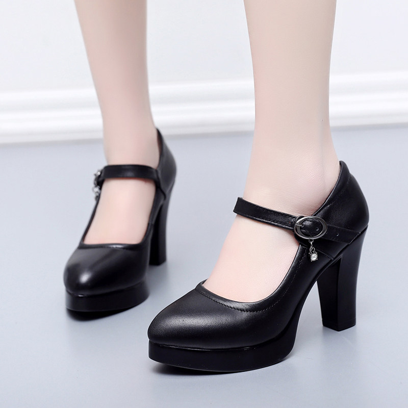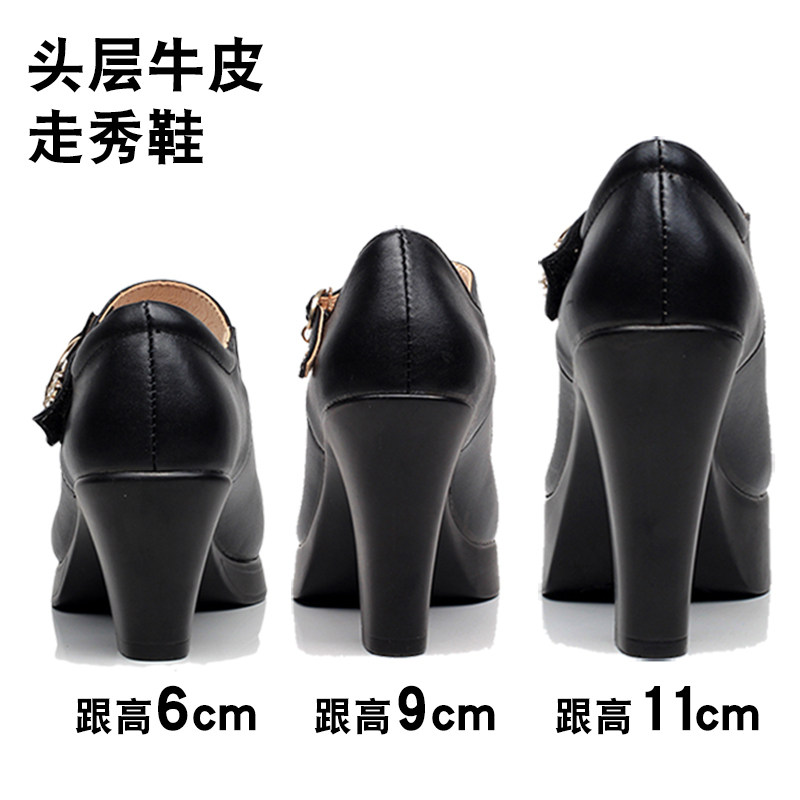 真皮走秀鞋女模特粗跟防水台配旗袍高跟鞋尖头一字扣单鞋女工作鞋