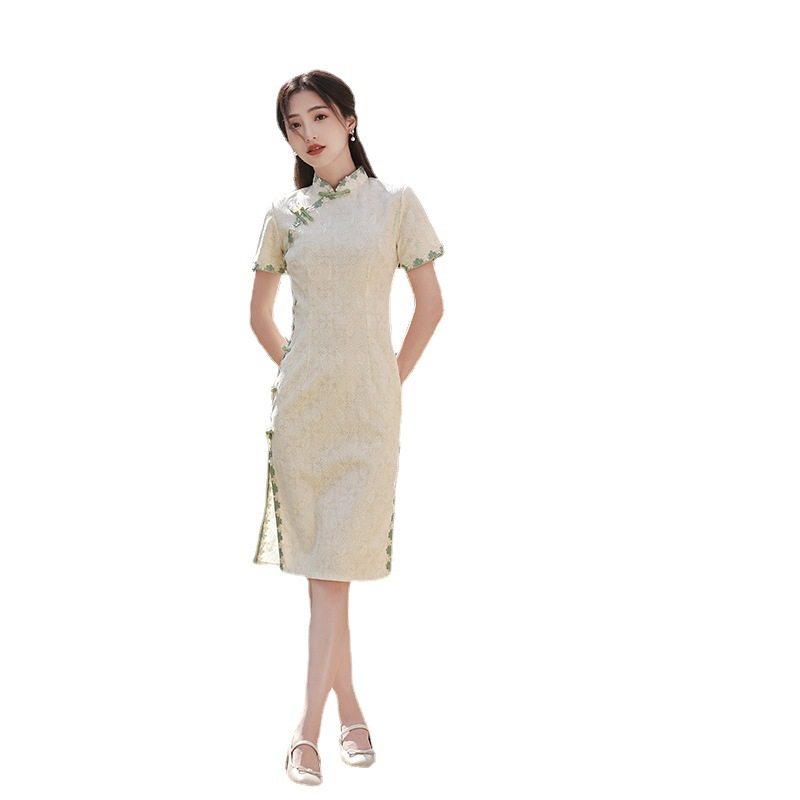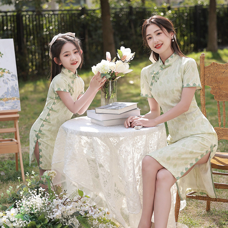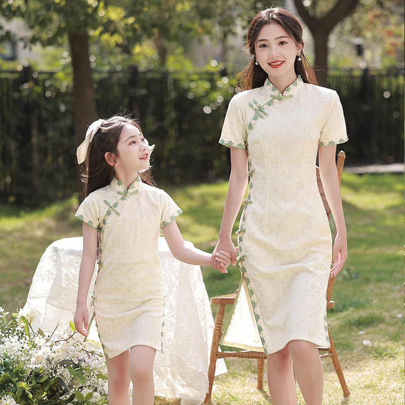 2023亲子旗袍母女装夏季新款复古女童连衣裙修身显瘦一模一样蕾丝