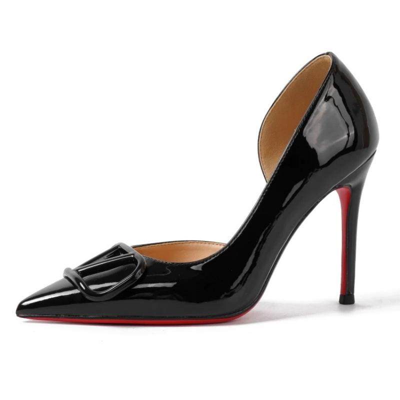 绝美V扣裸色高跟鞋女秋新款细跟尖头性感水钻红底鞋侧空浅口单鞋