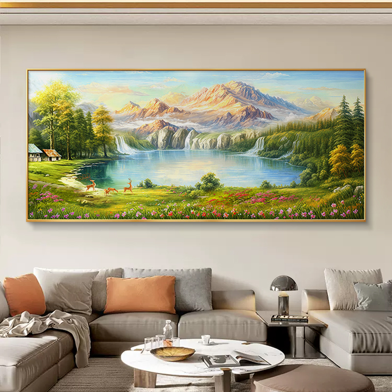聚宝盆山水画客厅挂画沙发背景墙装饰画西墙靠山图手绘油画壁画