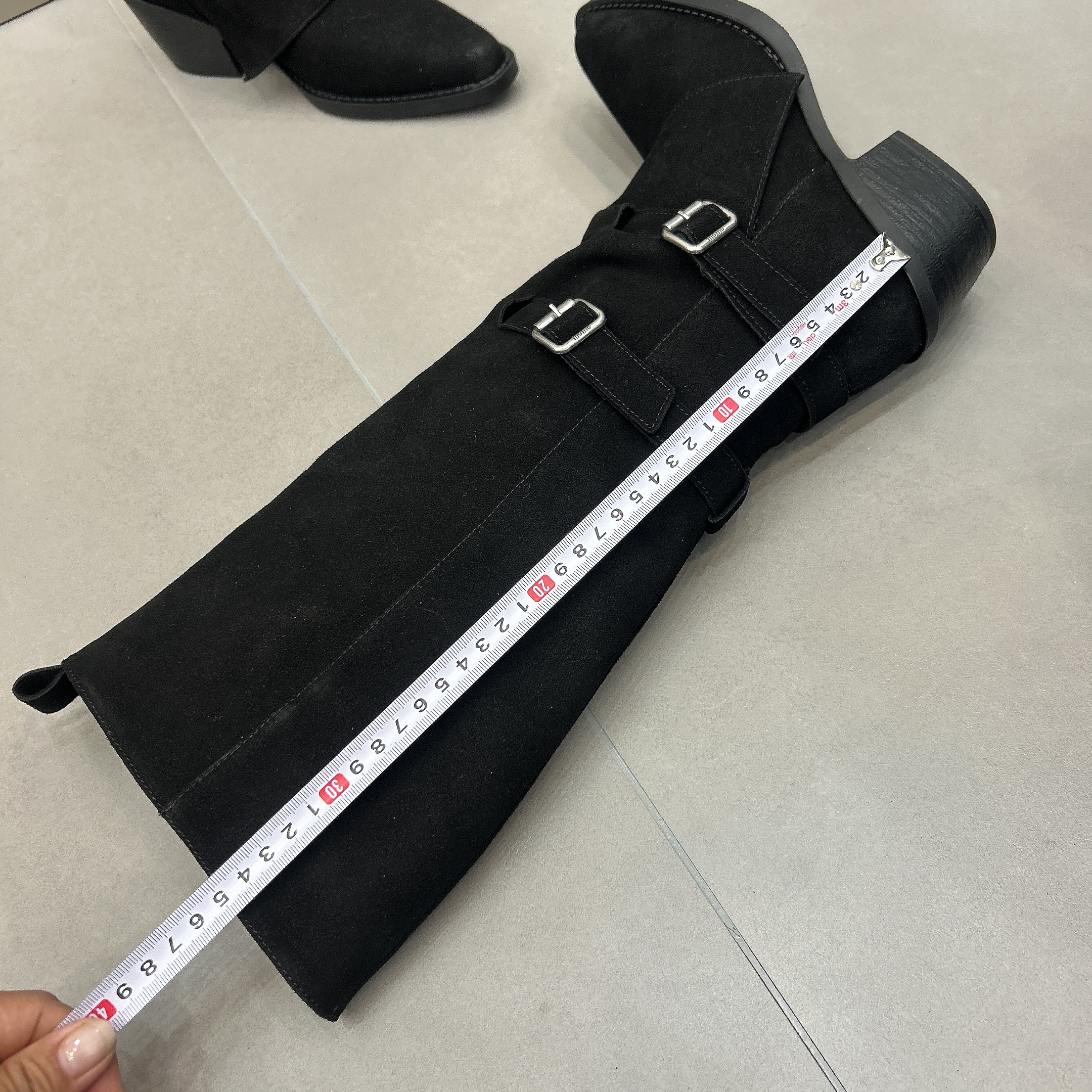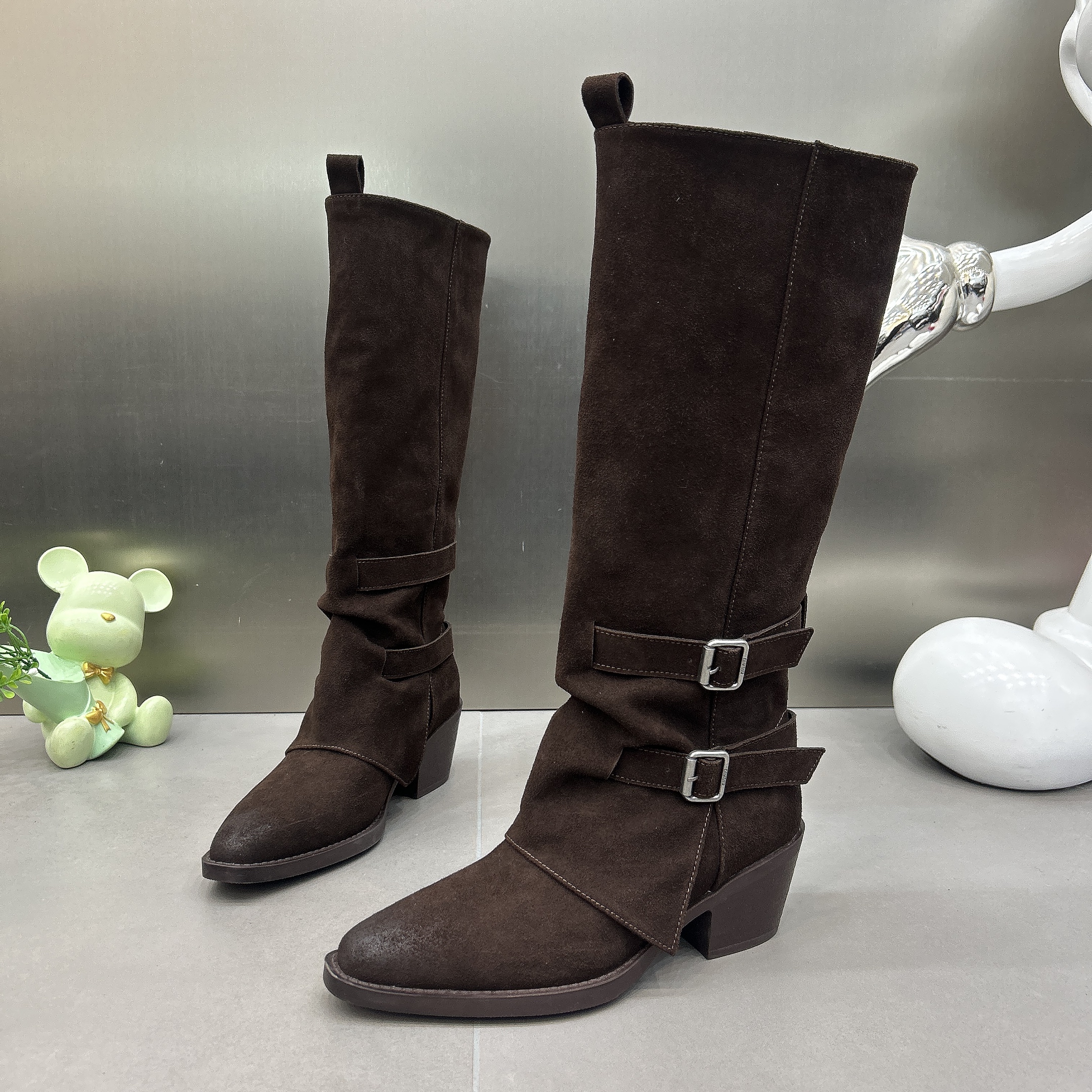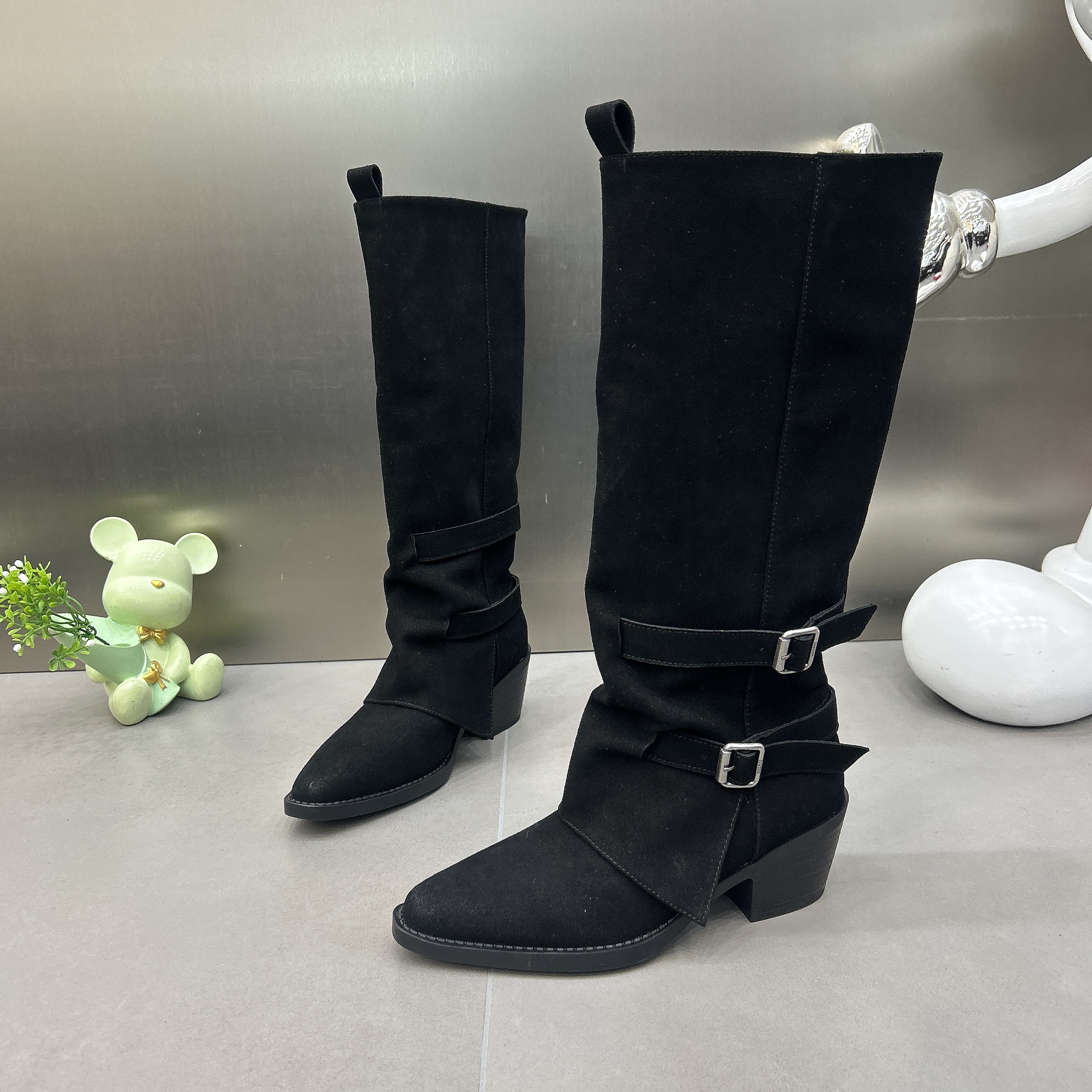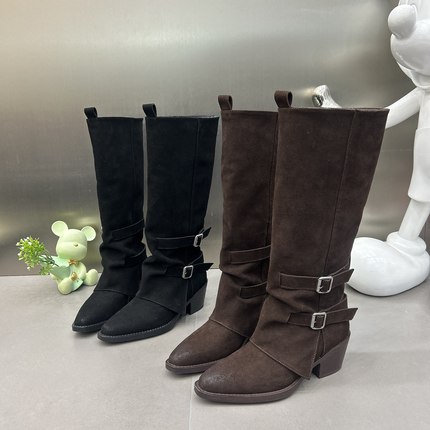 2025新款秋冬骑士靴粗跟6CM增高尖头瘦版宽筒皮带扣马丁靴女长靴
