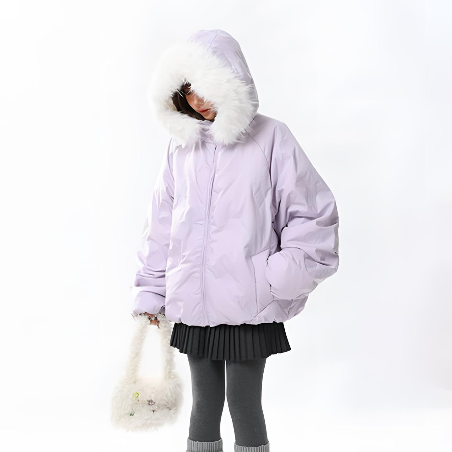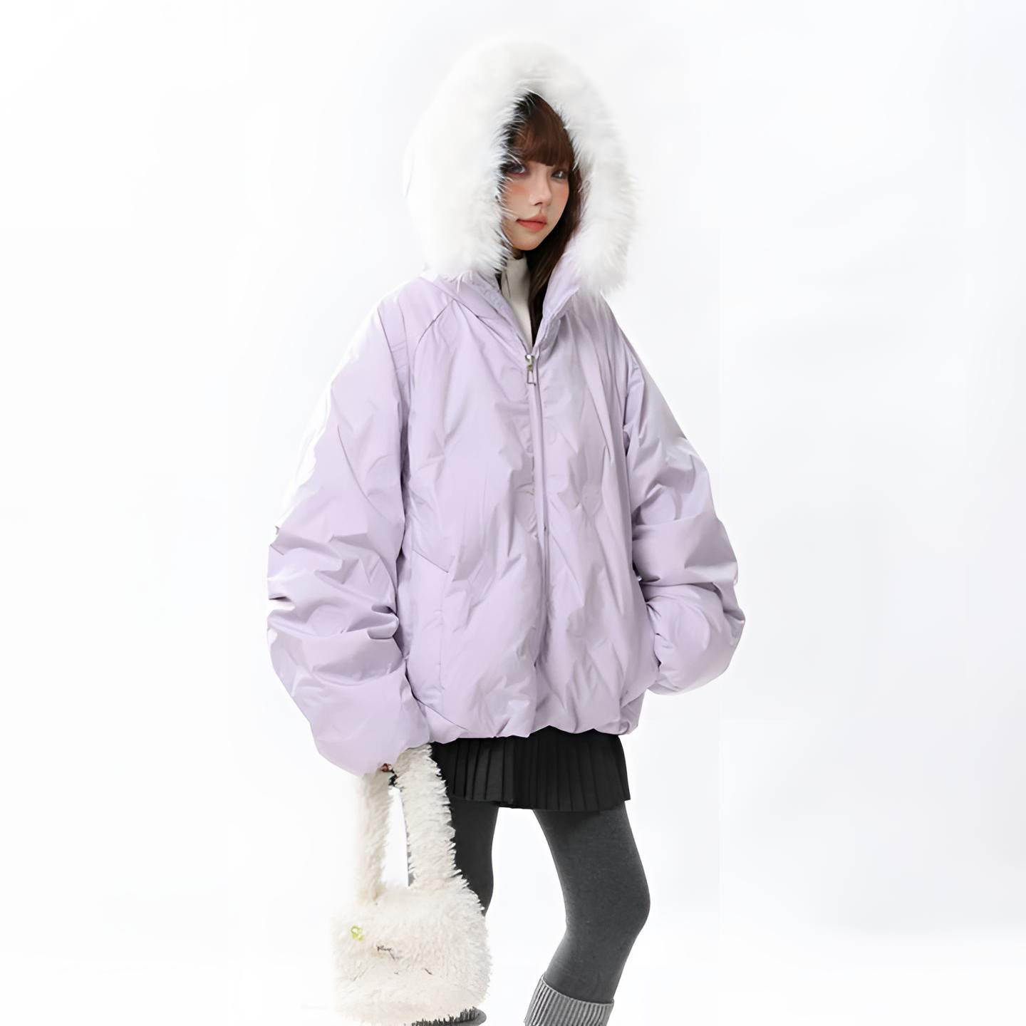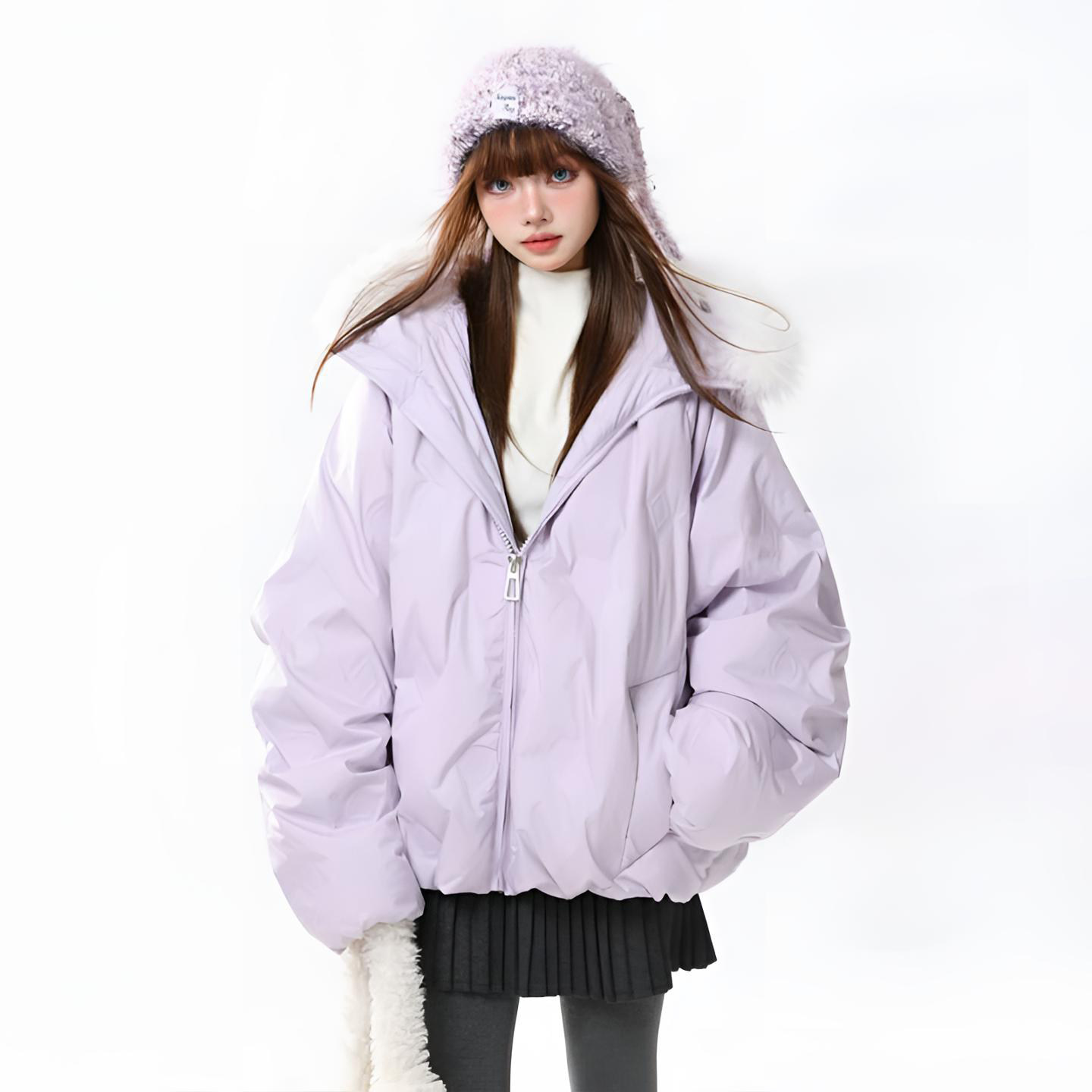 大码女装胖mm学院风加厚紫色保暖外套女2025新款宽松百搭连帽棉服