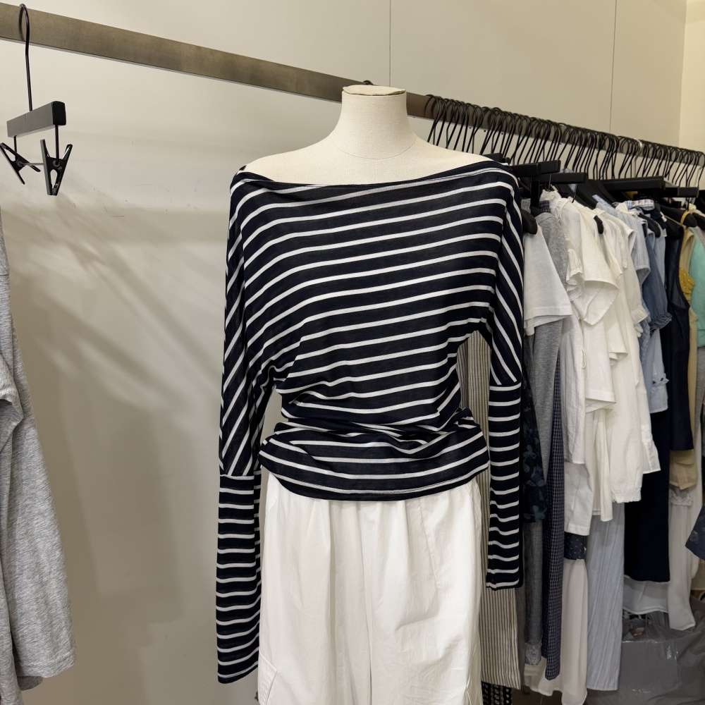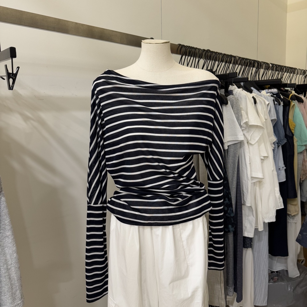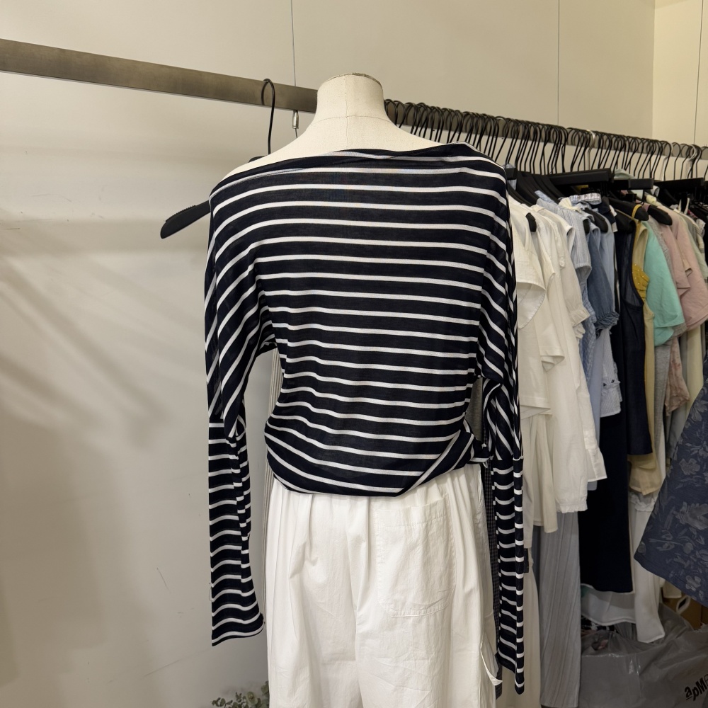 气质条纹薄款斜肩长袖t恤女2025秋季新款显瘦气质露肩一字领上衣