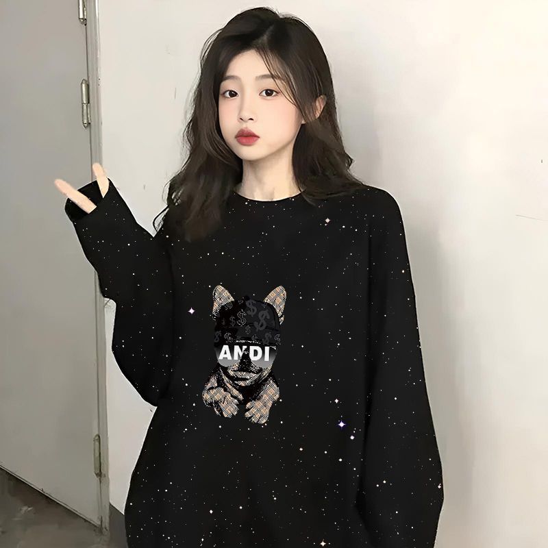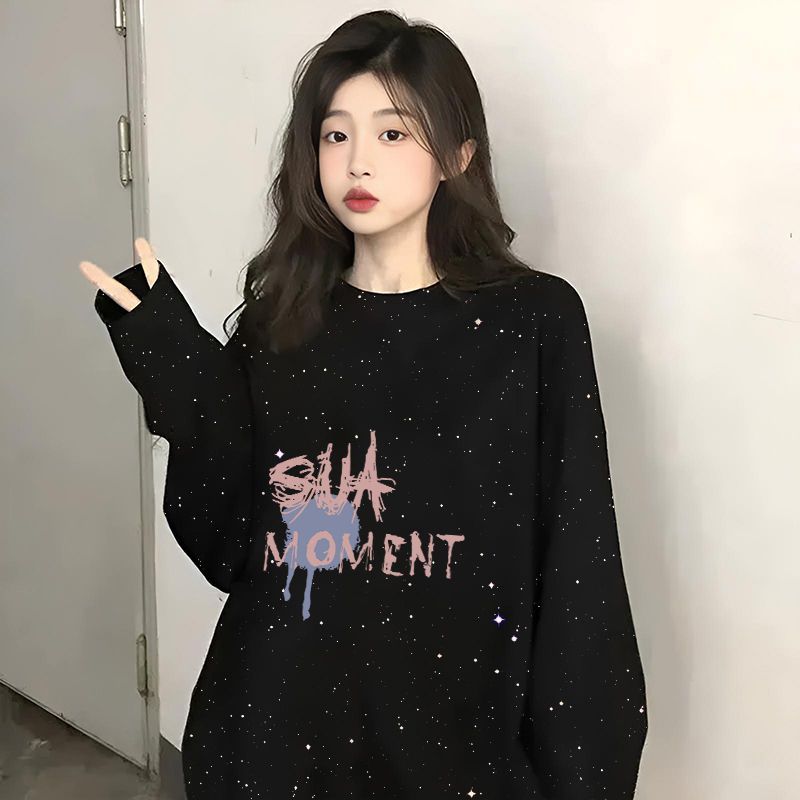 中长款满天星长袖体恤女款黑色新款圆领秋季宽松显瘦别致印花上衣