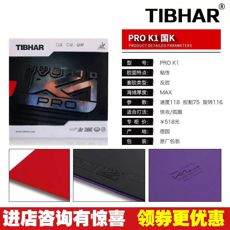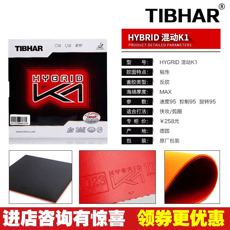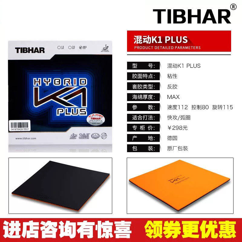 Tibhar乒乓球拍套胶皮德国挺拔K2混动国红蓝K1plus粘性套胶反胶