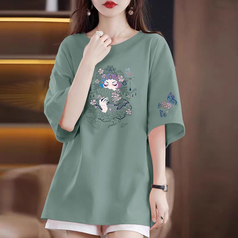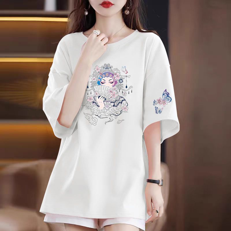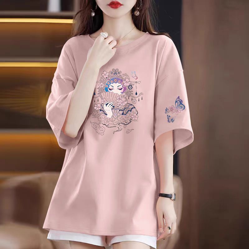 夏女装100%纯棉短袖圆领T恤韩版洋气宽松遮肚显瘦中长款百搭上衣