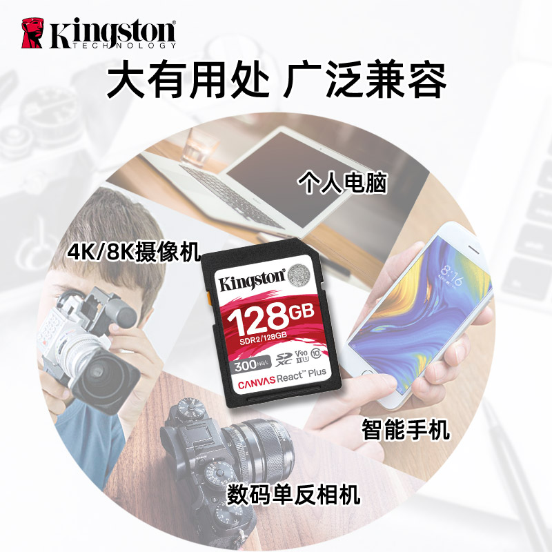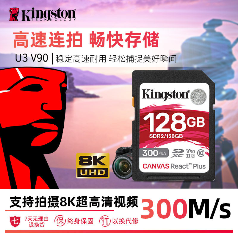 金士顿SDR2 128G内存卡 SD卡 读速度300M/S相机存储卡V90支持8K