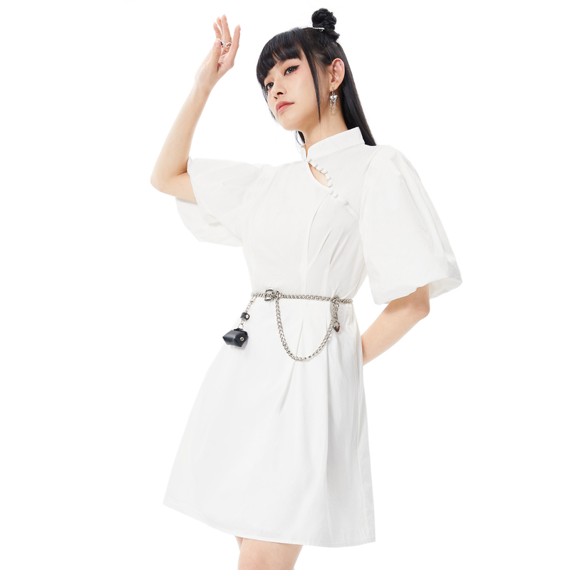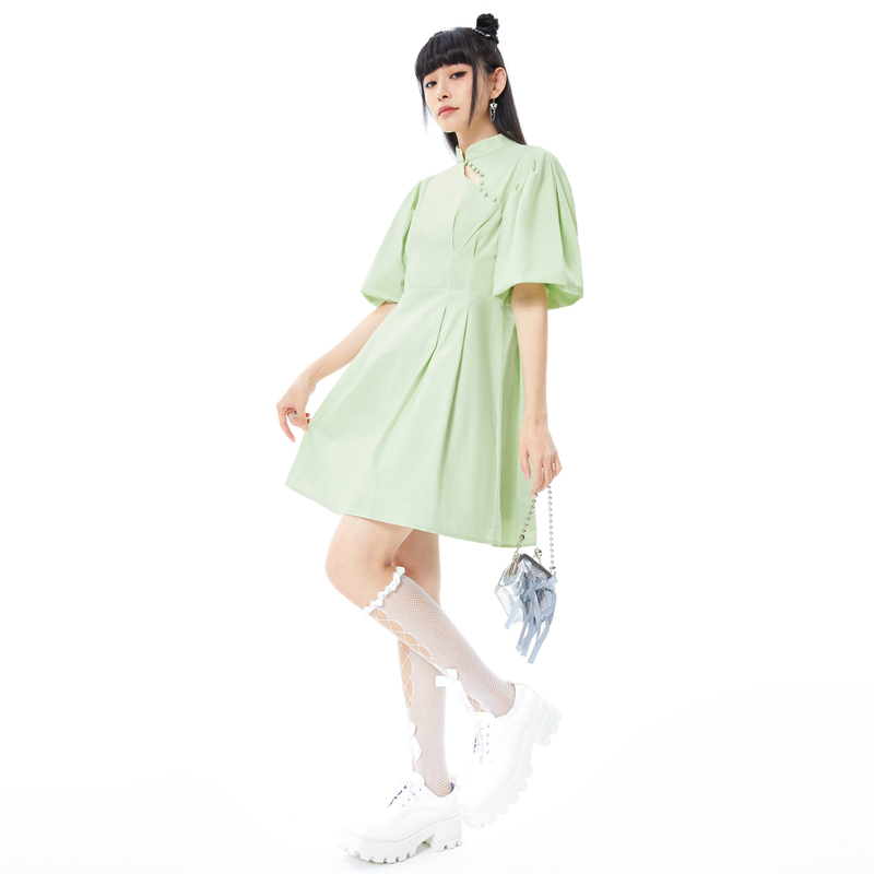 A21女装梭织立领泡泡短袖A摆短连衣裙时尚新款气质设计感显瘦短裙