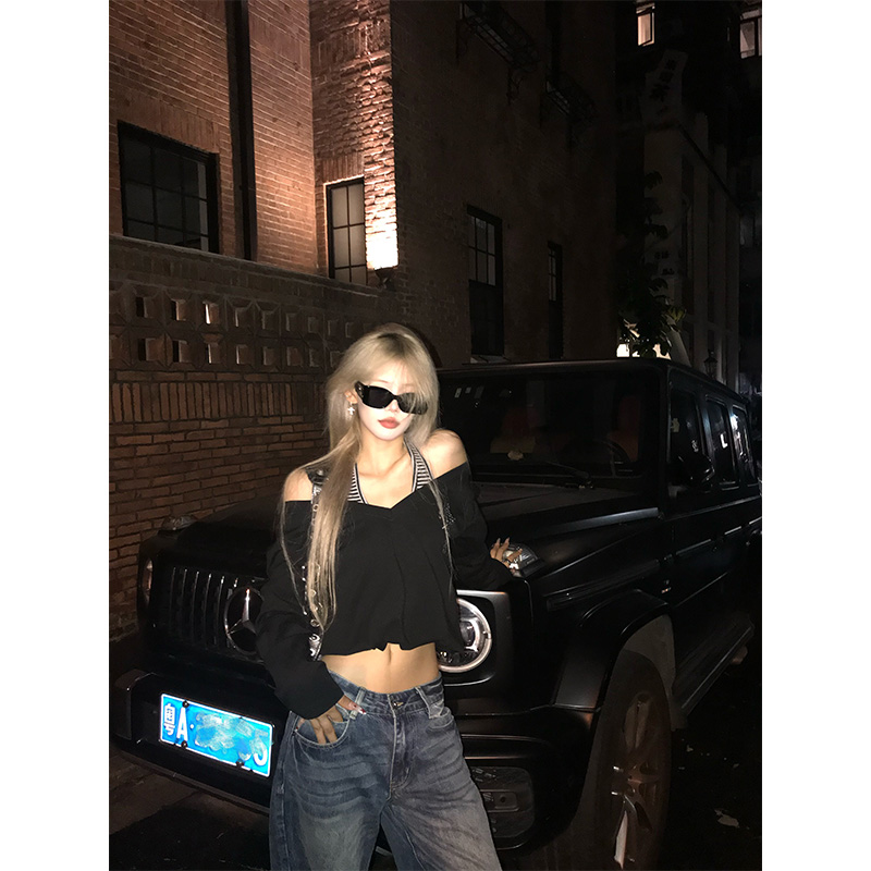 NECOYEP 美式小众时尚假两件挂脖长袖T恤女辣妹露肩显瘦打底衫