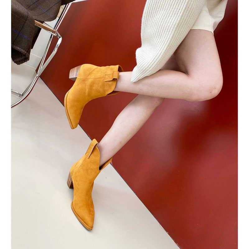 小小苏东大门韩国棕色绒面牛仔靴女西部靴尖头套筒粗跟马丁靴短靴