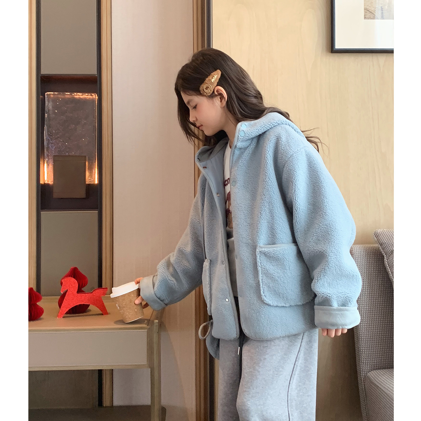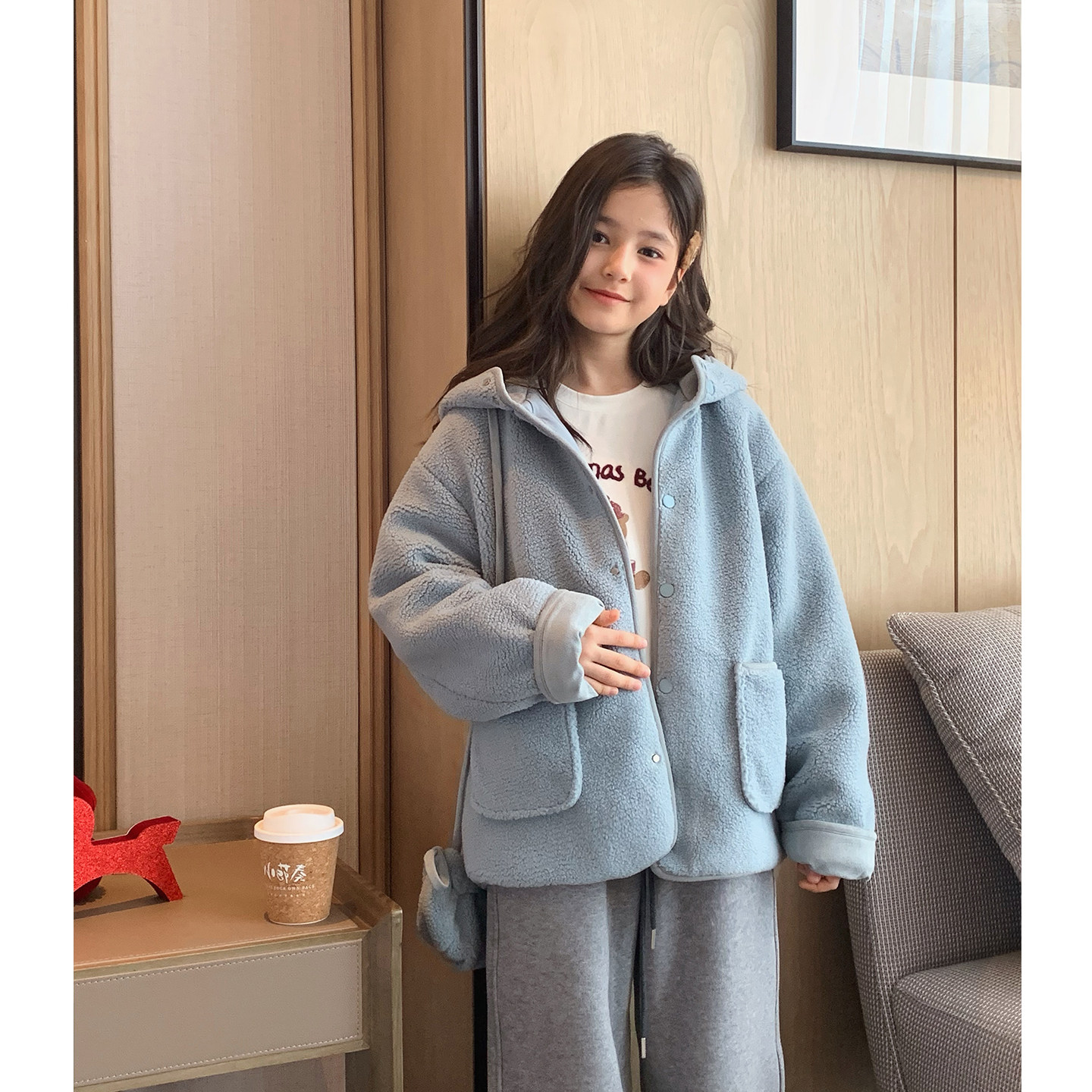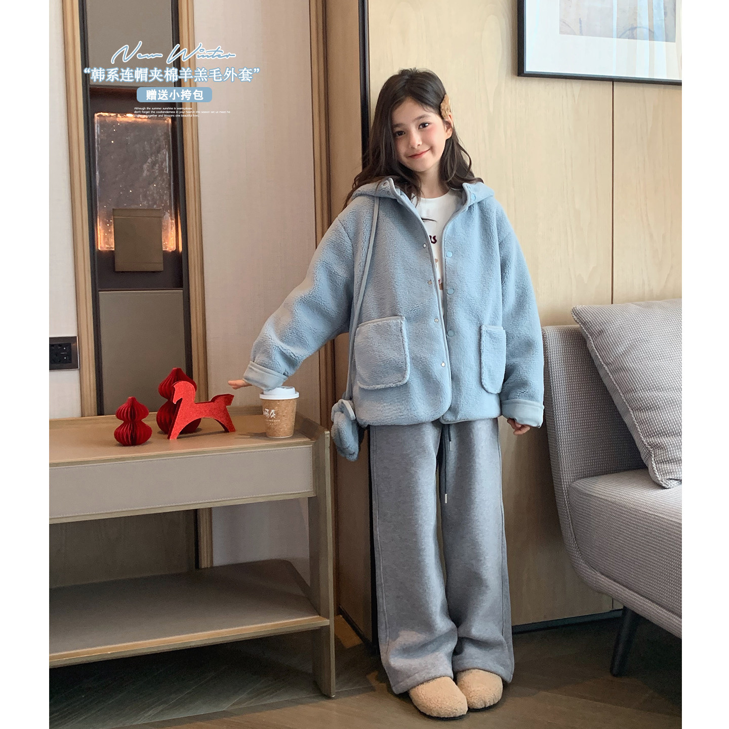 女大童连帽毛绒外套2025冬装新款青少年夹棉加绒开衫学生保暖上衣