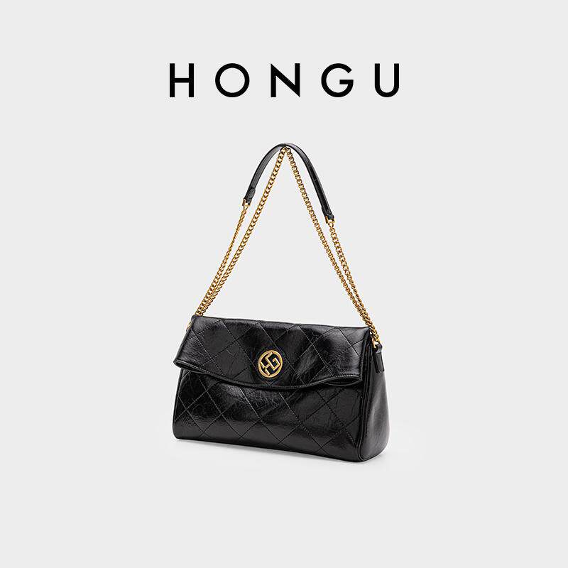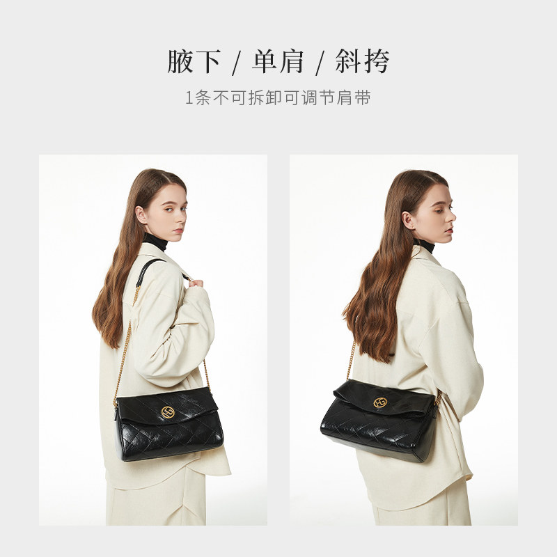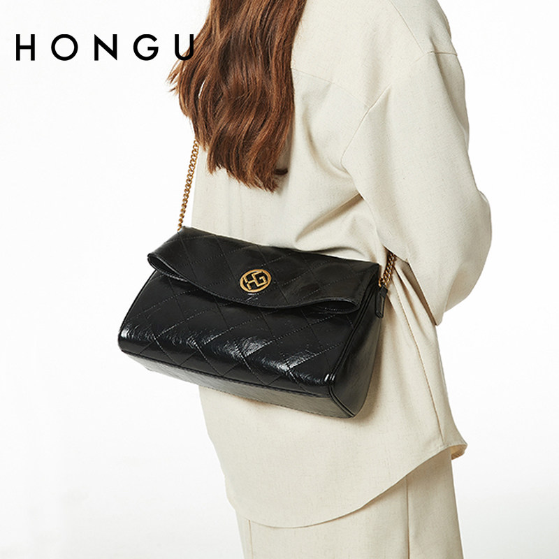 红谷女包欧美时尚高级感牛皮腋下包翻盖菱格链条包百搭休闲单肩包