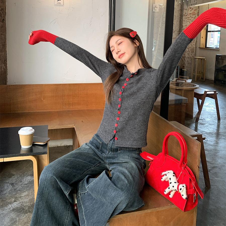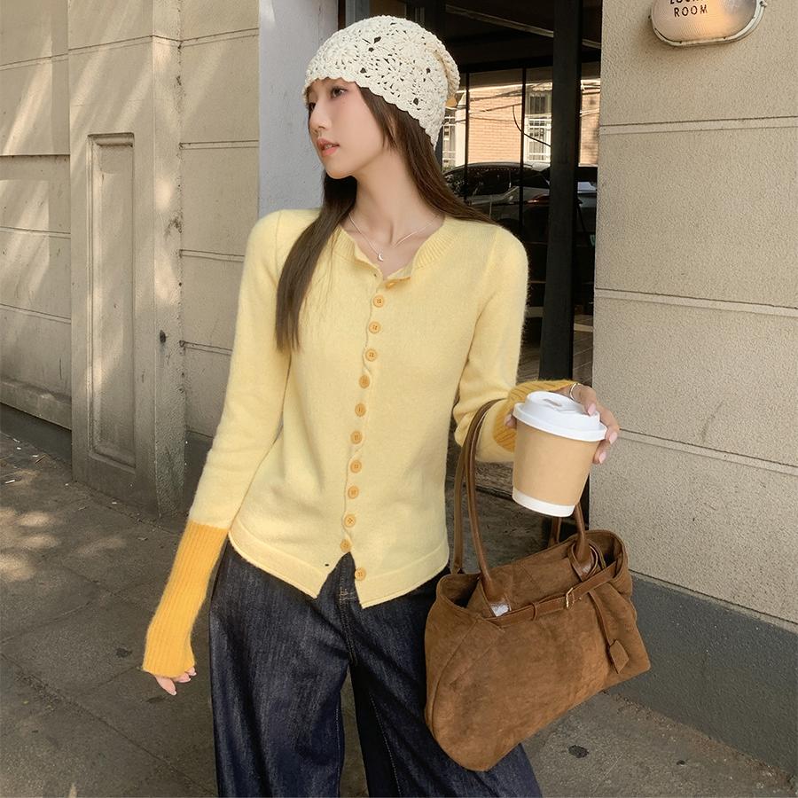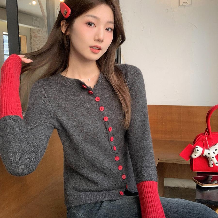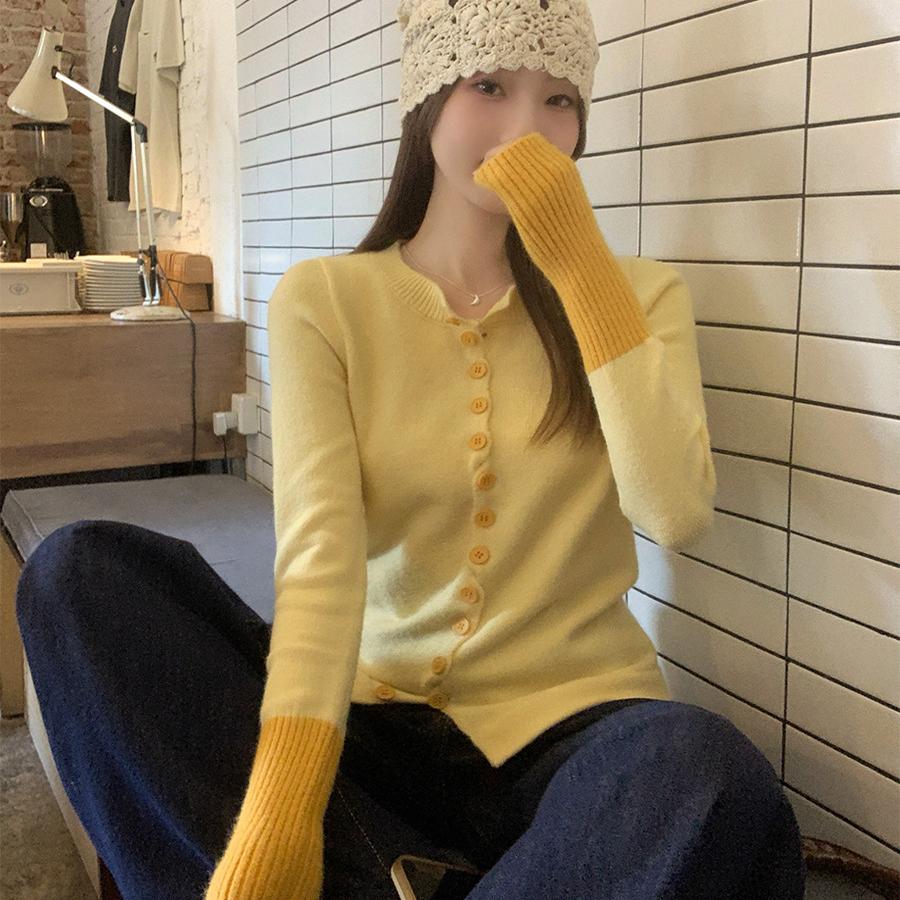 设计感小众撞色单排扣针织开衫甜美修身显瘦长袖内搭毛衣单穿上衣