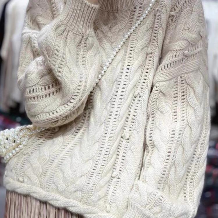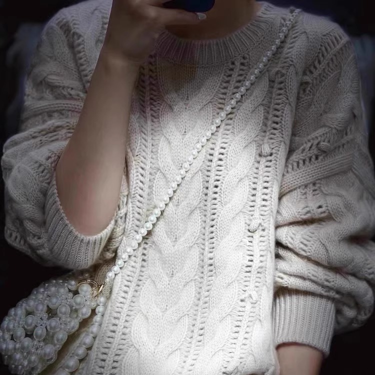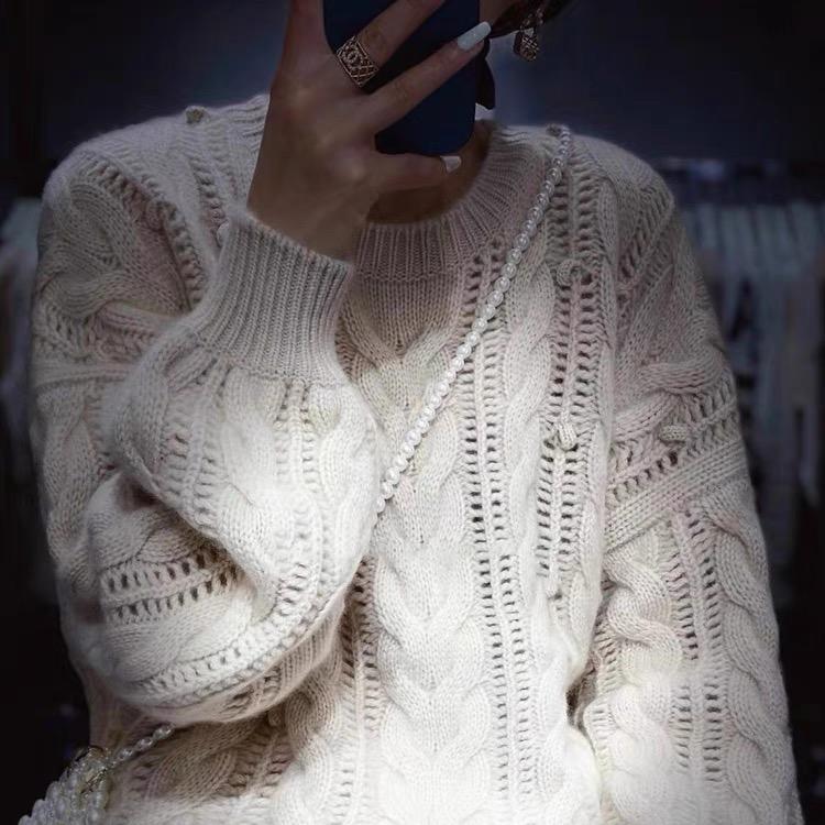 欧货100纯羊毛衫女圆领宽松加厚镂空麻花时尚慵懒风毛衣女外穿