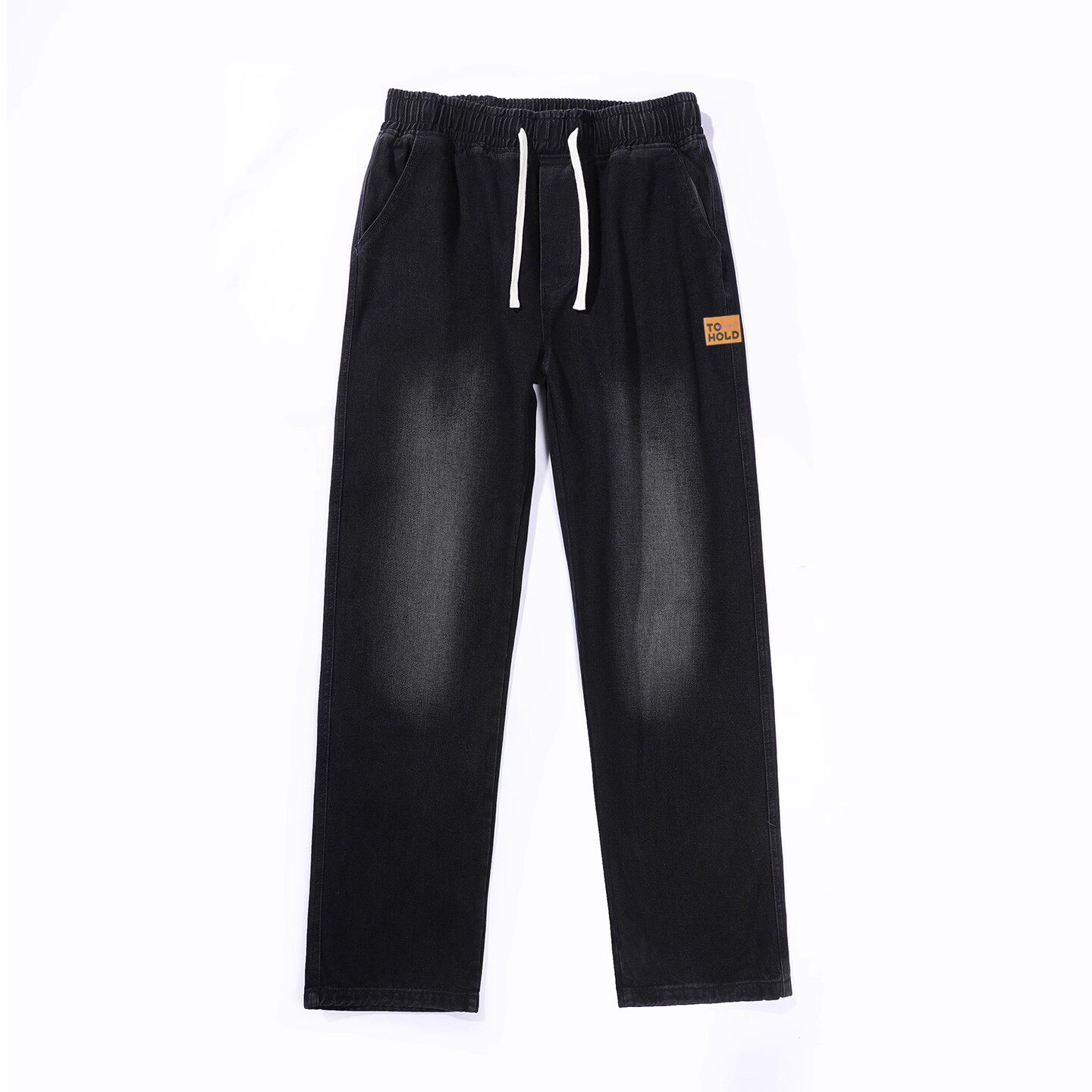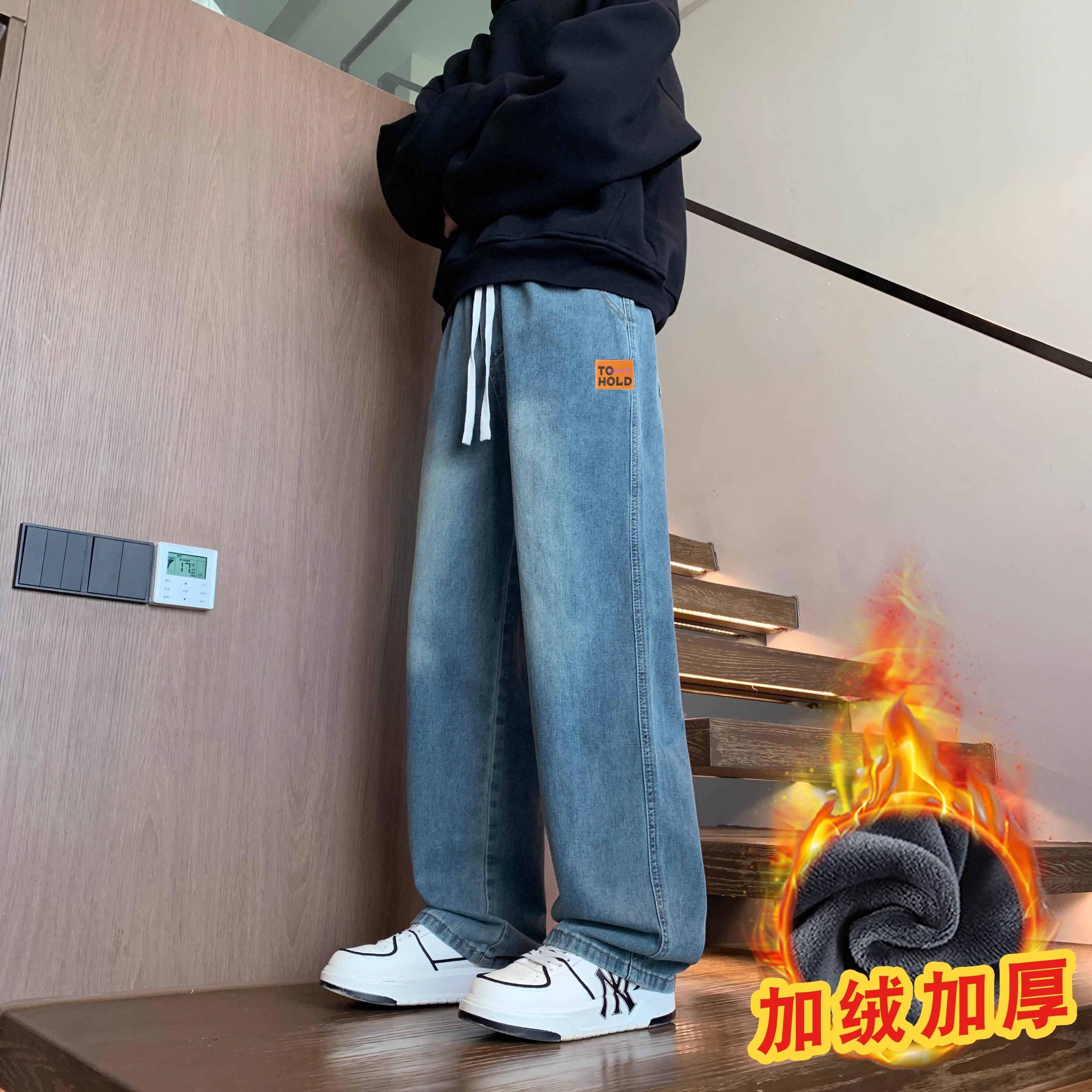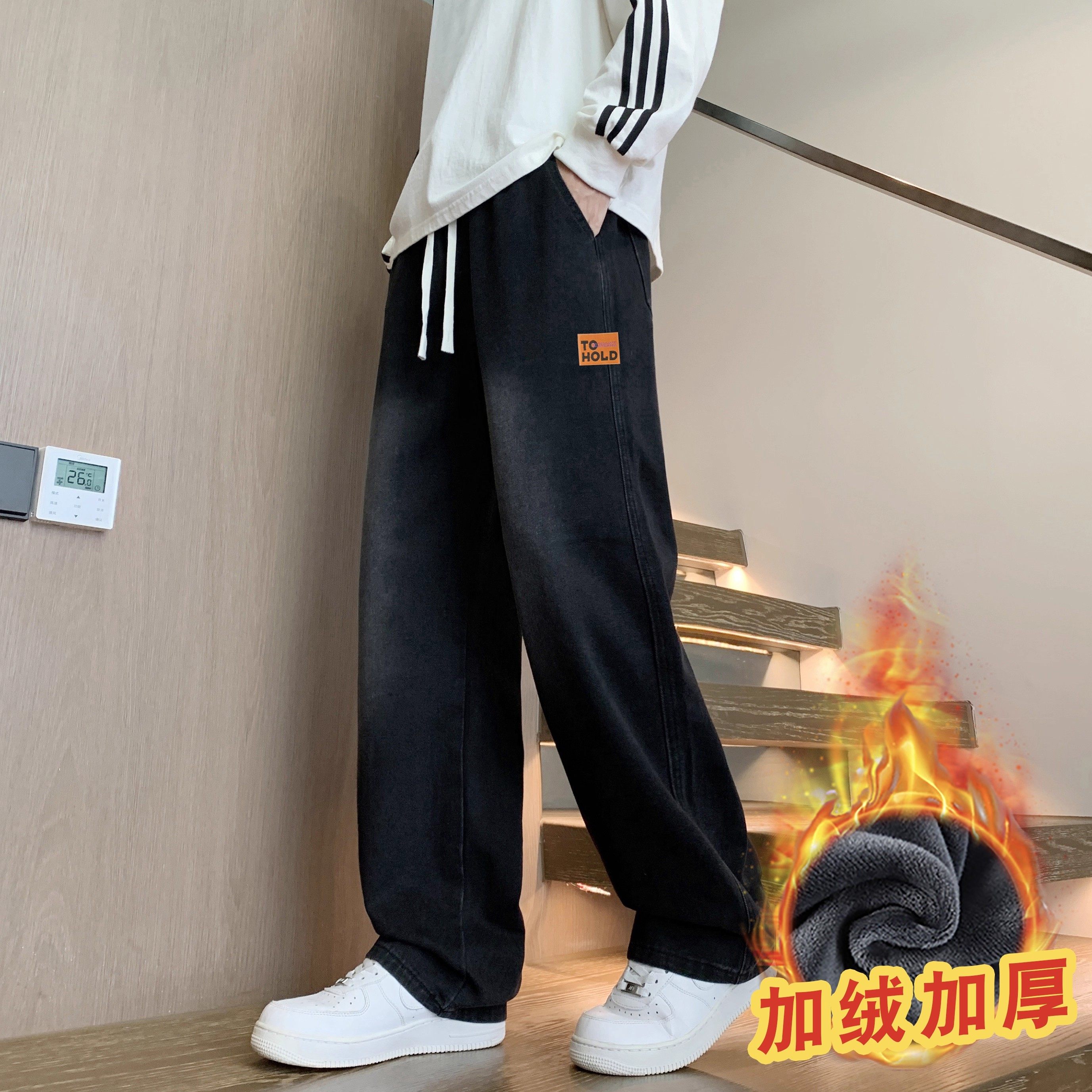 秋冬新款青少年加绒加厚牛仔裤渐变贴标设计宽松直筒男生百搭长裤