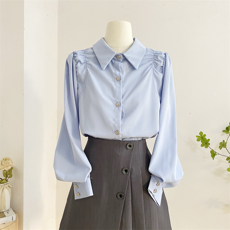 宽松法式长袖雪纺褶皱衬衫爱心扣