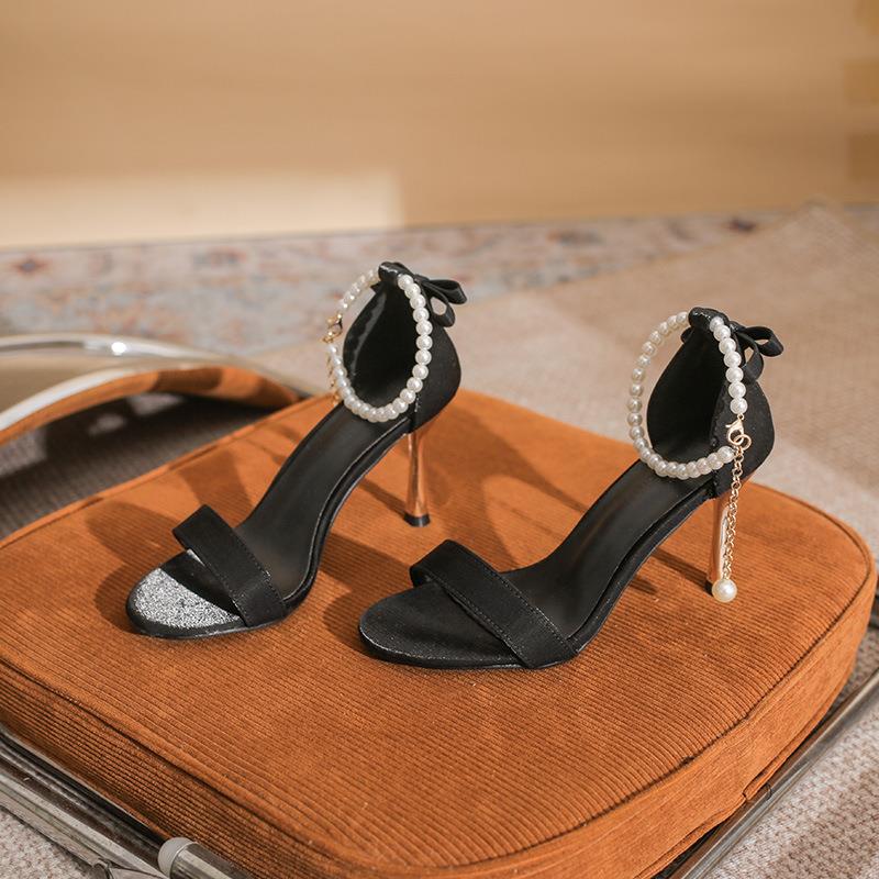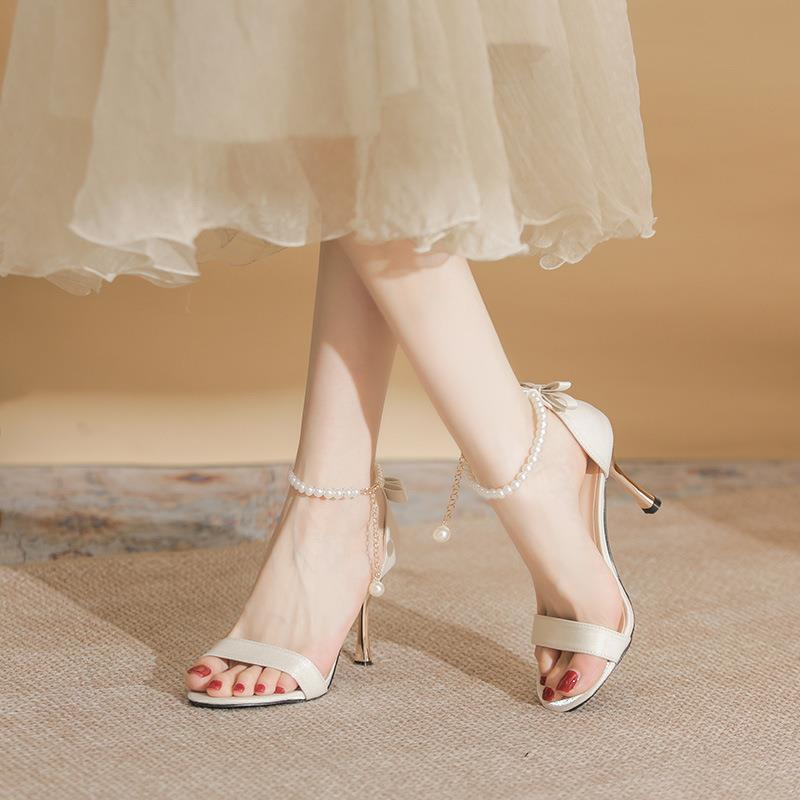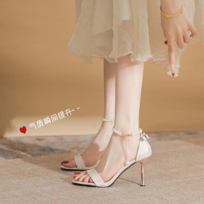 2025夏季新款一字扣高跟凉鞋大码加肥加宽浅口舒适女鞋珍珠百搭