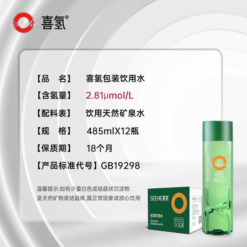 喜氢SEEHE含氢包装饮用水485ml*12瓶 弱碱性矿物富氢水 水素水