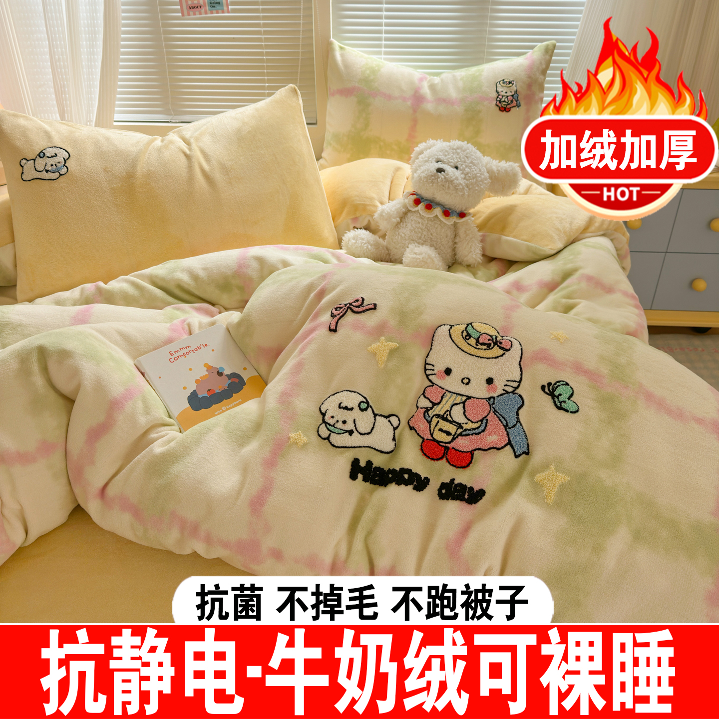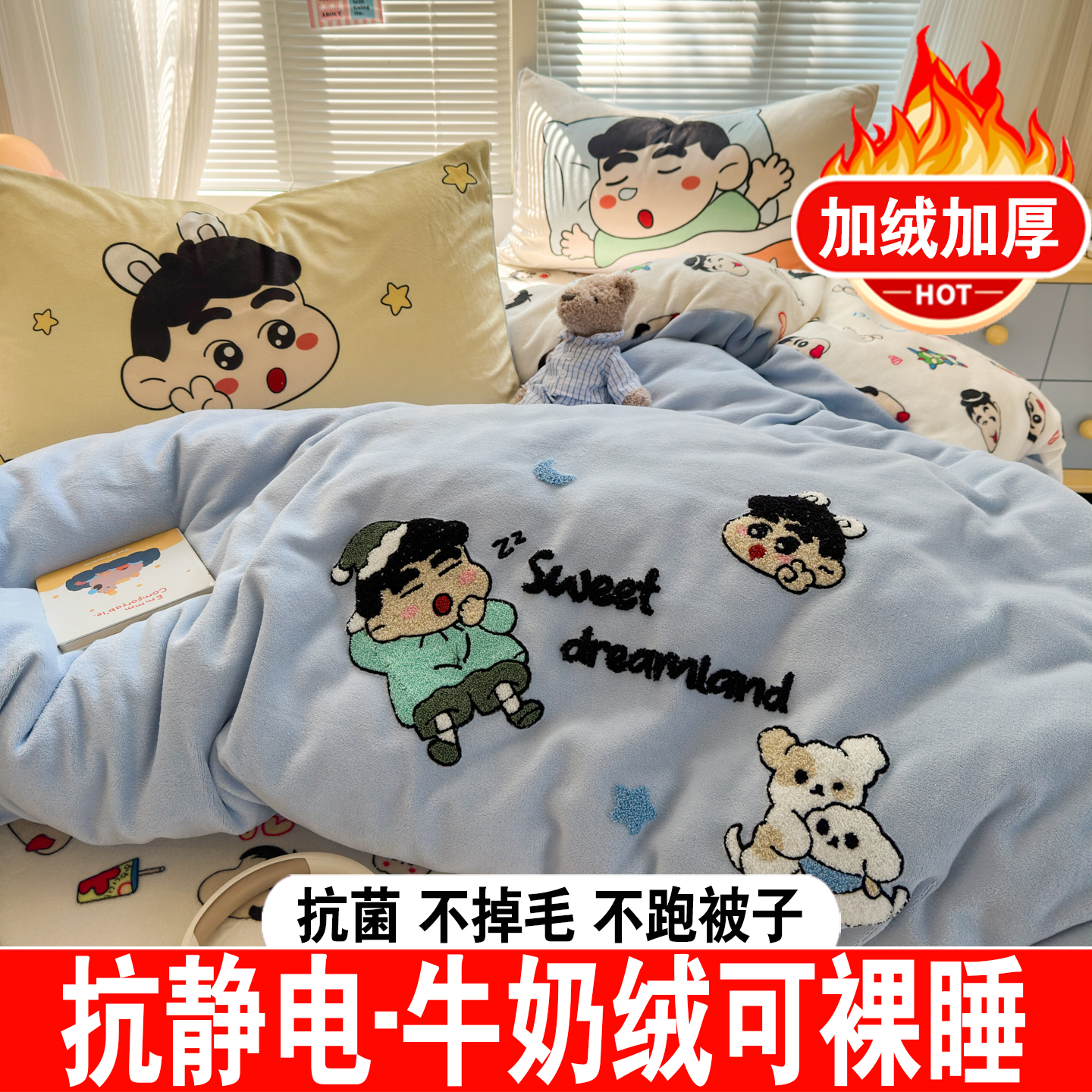 蜡笔小新牛奶绒四件套冬季加厚珊瑚绒被套床单宿舍儿童床品三件套