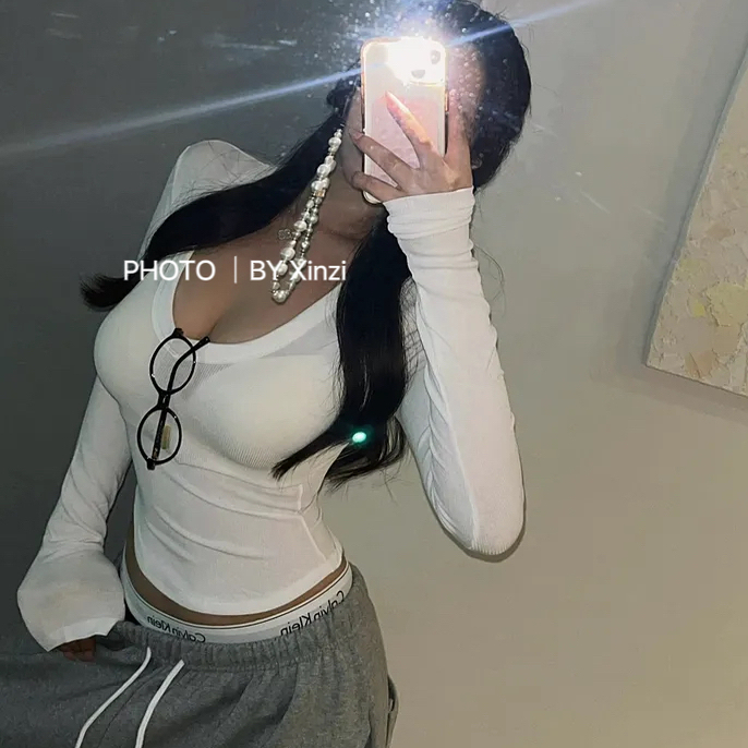 辛子韩国代购纯欲风性感辣妹V领长袖T恤女修身显瘦打底衫上衣