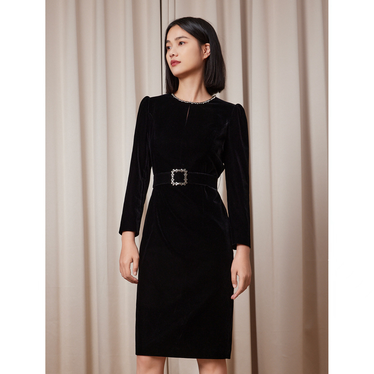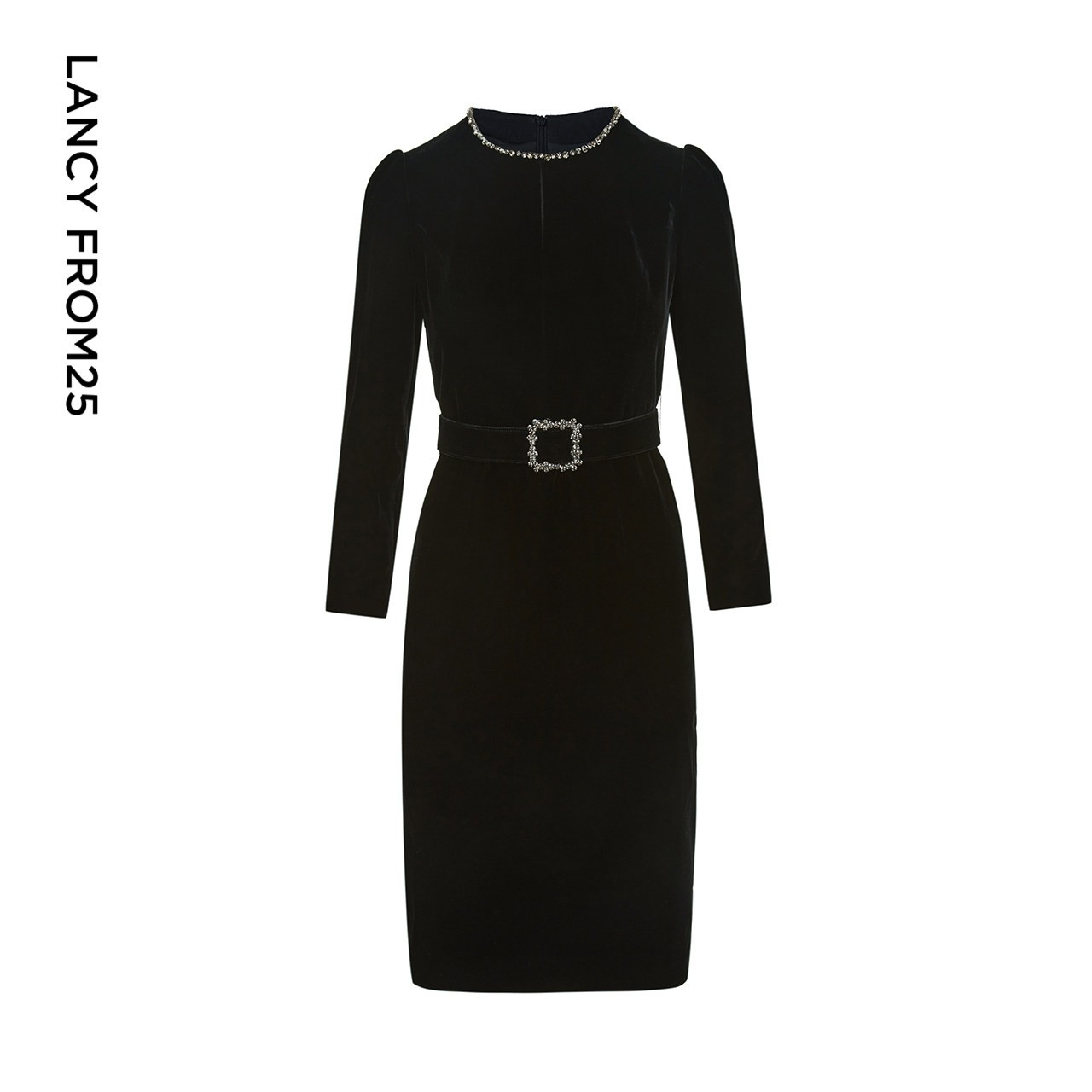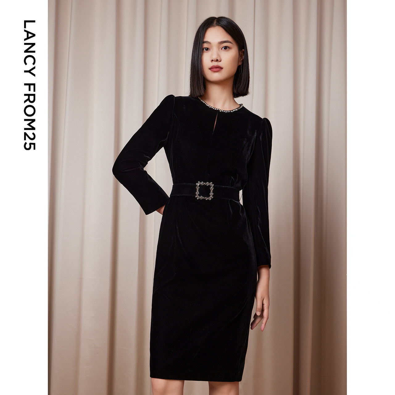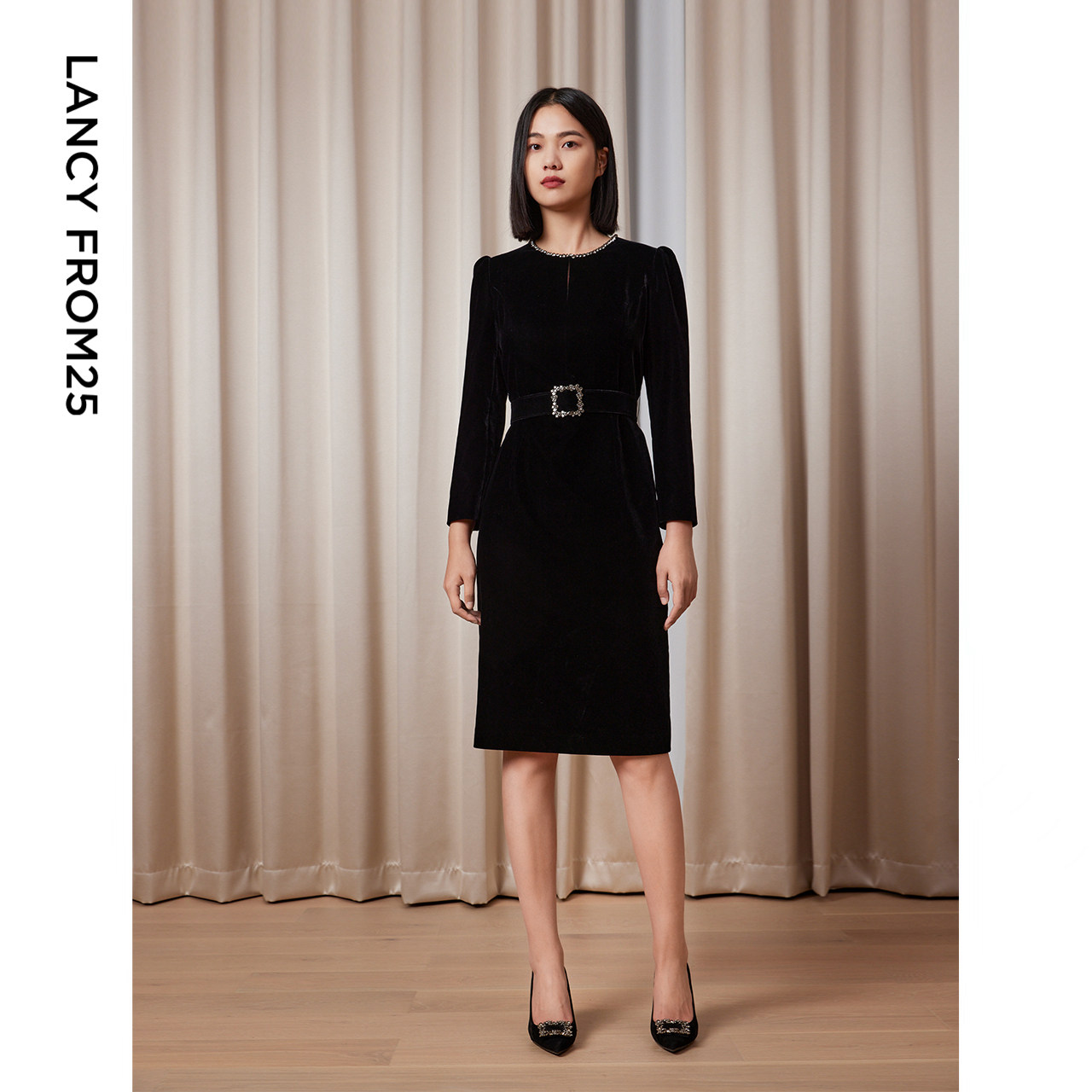 LANCY/朗姿女装2023秋季新款法式职业黑色连衣裙子女收腰显瘦