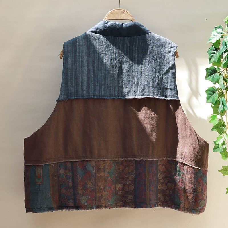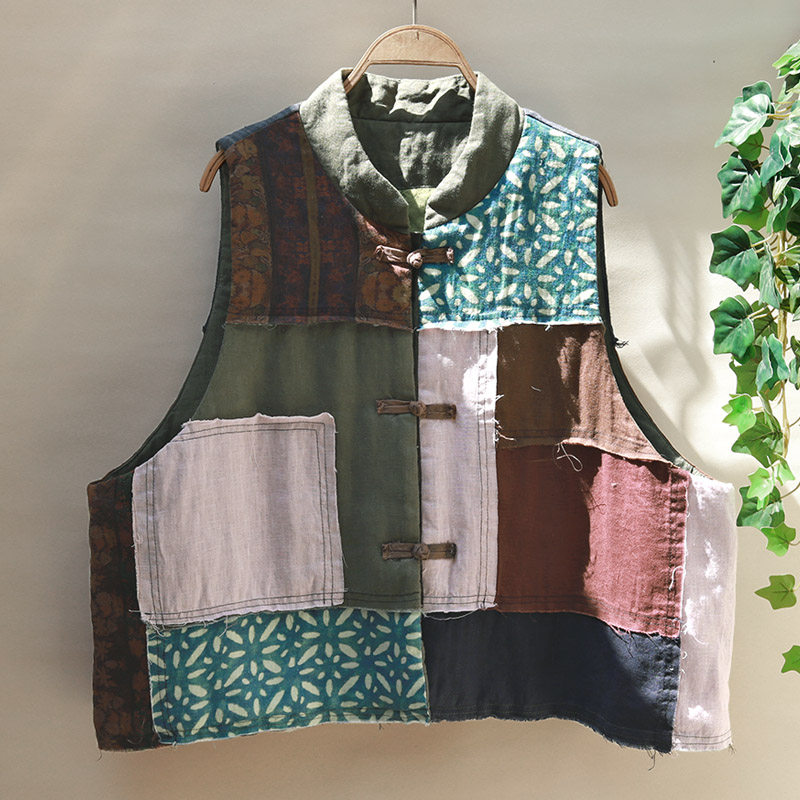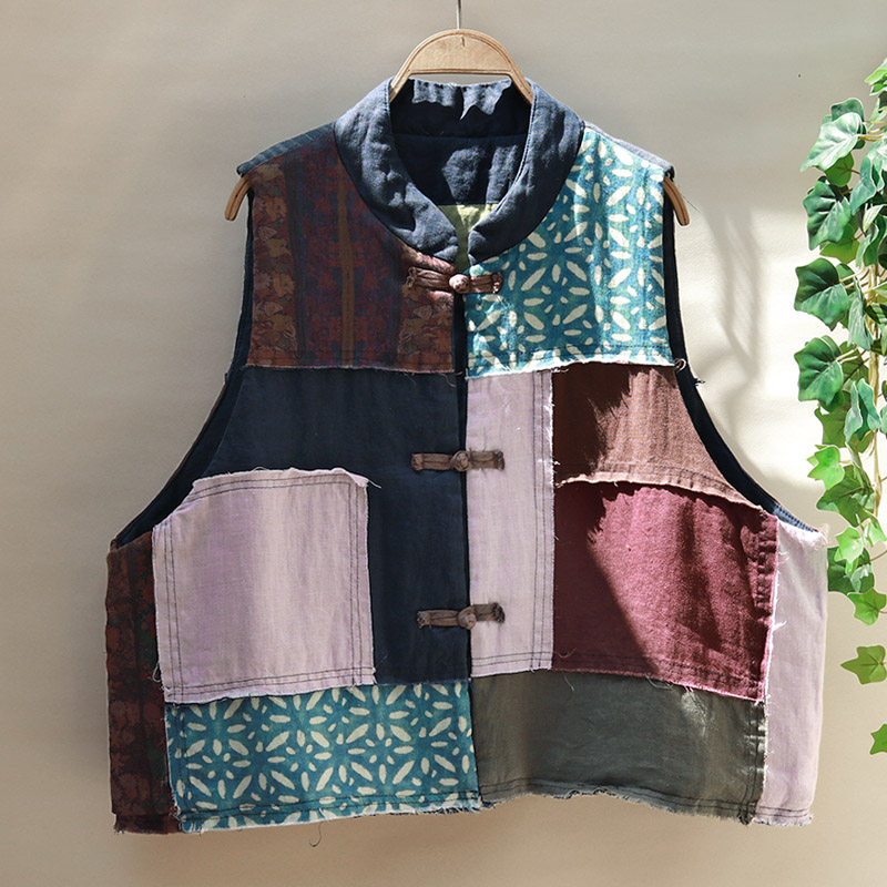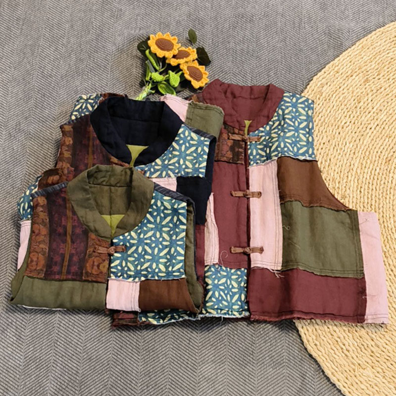 复古民族风老布拼接马夹薄棉衣无袖外套国潮盘扣马甲百家布棉背心
