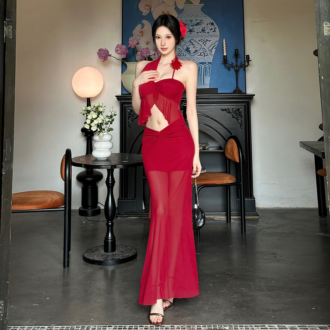 花朵挂脖吊带薄纱透视长裙套装女