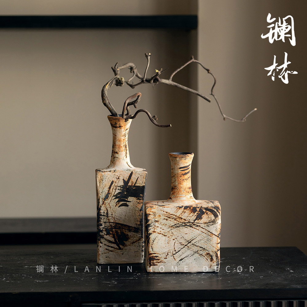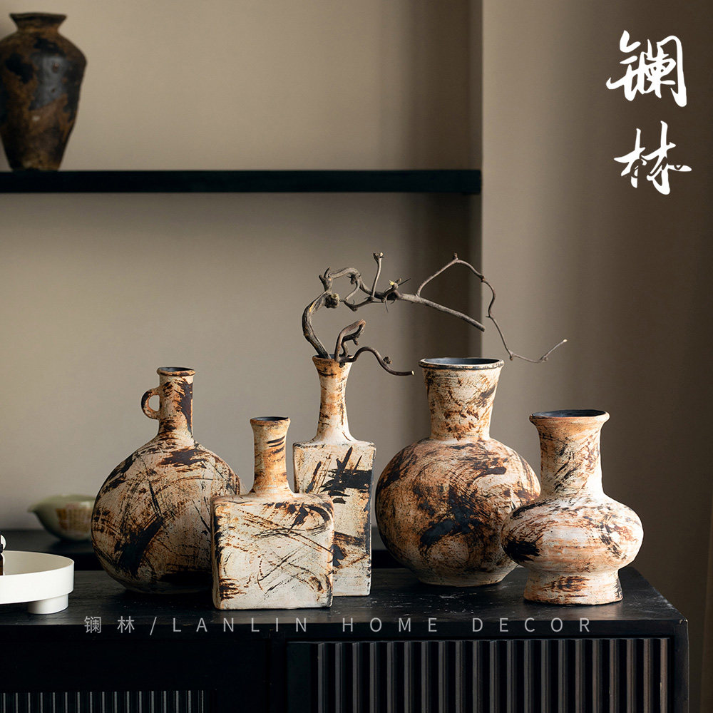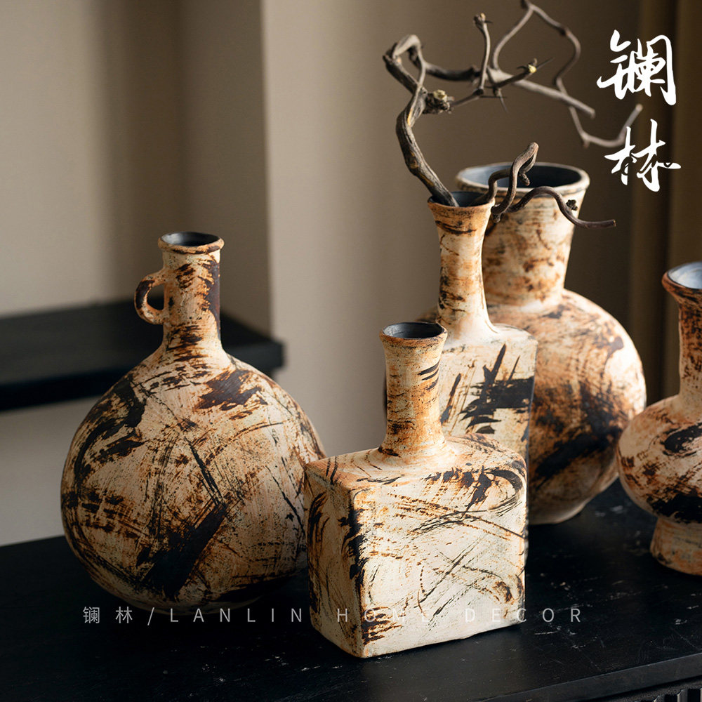 景德镇侘寂风复古粗陶小花瓶文艺插花瓶客厅玄关酒店陶瓷粗陶花器