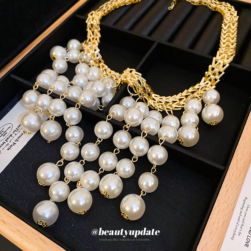 字母珍珠流苏项链法式夸张设计感锁骨链时尚优雅复古气质项饰