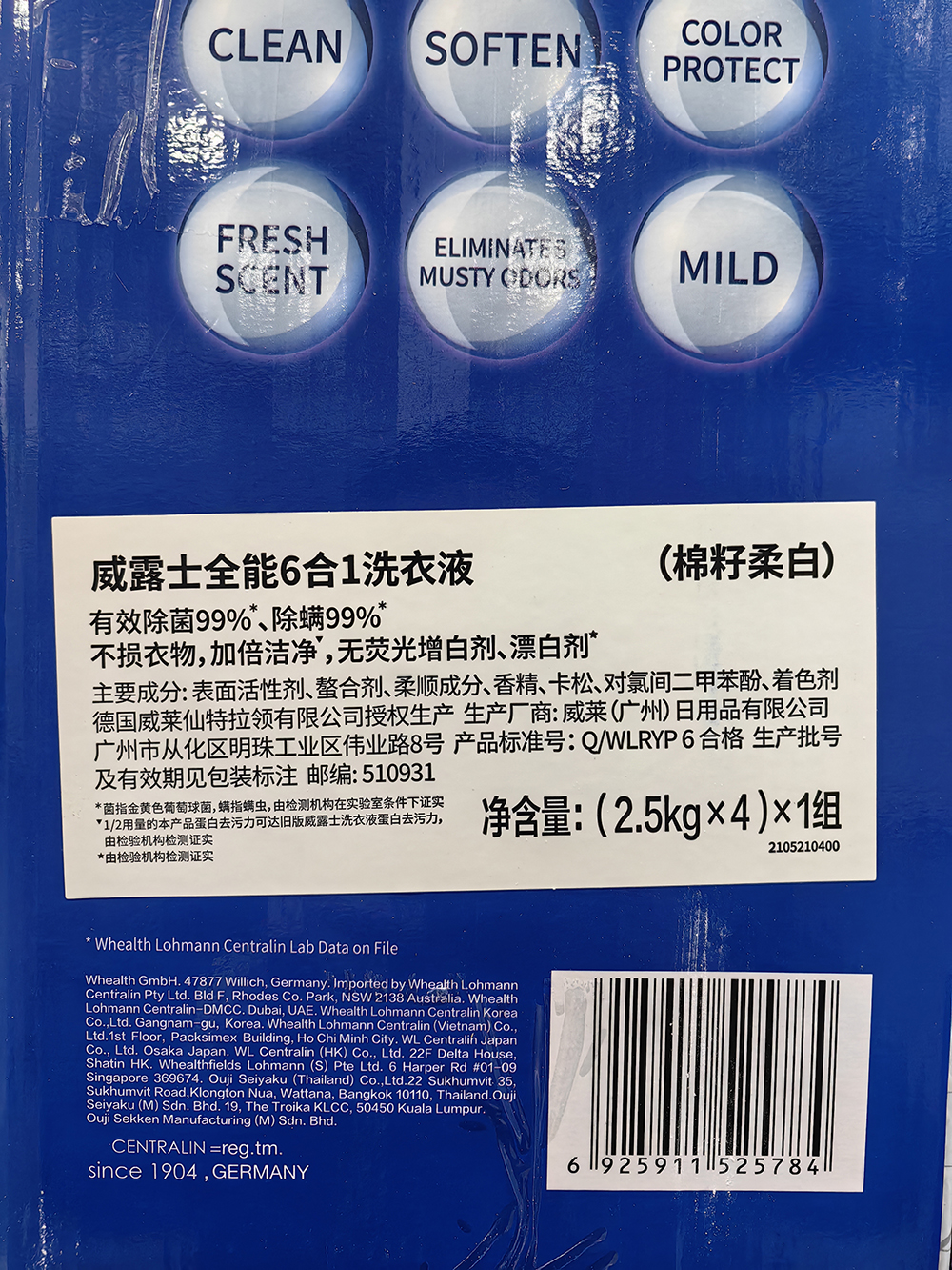 山姆代购 威露士6合1洗衣液棉籽柔白 家庭宿舍除菌除螨去污实惠装